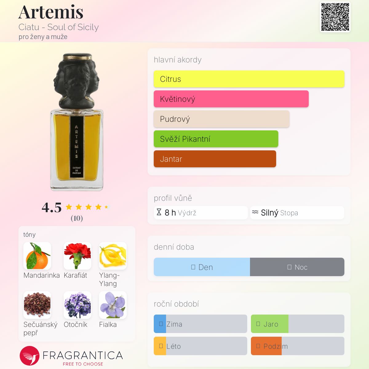 Artemis podle Ciatu - Soul of Sicily je Orientální Floral vůně pro ženy a muže. Toto je nová vůně. Artemis byl/a uveden/a v roce 2025. Vrchní tóny jsou Mandarinka, Sečuánský pepř, Sladký pomeranč, Bergamot a Badyán; střední tóny jsouKarafiát, Ylang-Ylang, Otočník, Fialka a Šalvěj muškátová ; základní tóny jsou Ambrette (přírodní pižmo), Benzoin, Jantar (ambra), Labdanum a Vetiver.