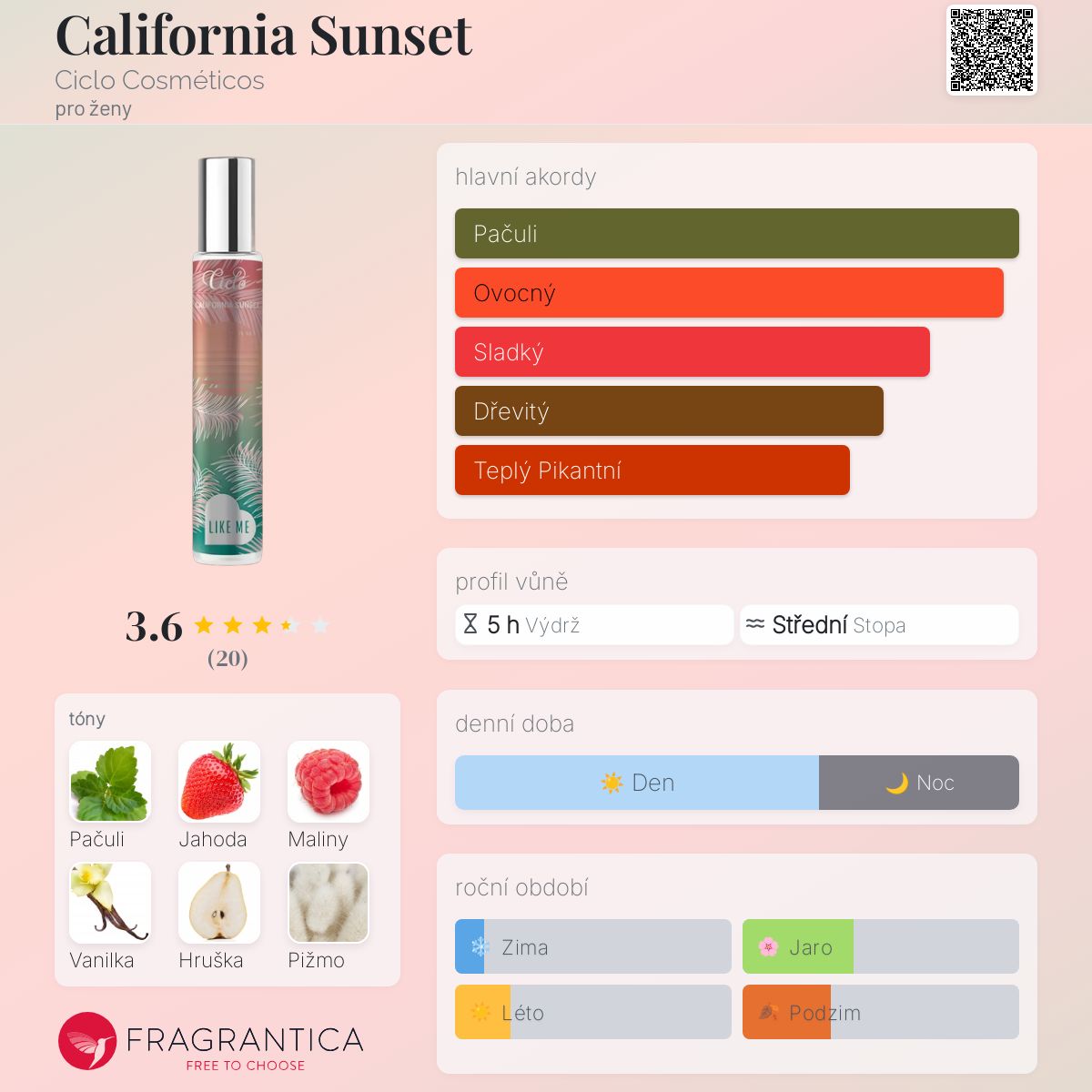 California Sunset podle Ciclo Cosméticos je Chypre Fruity vůně pro ženy. California Sunset byl/a uveden/a v roce 2020. "Nosem" za touto vůní je Alfredo Monteiro Filho. Vrchní tóny jsou Jahoda, Maliny a Hruška; střední tóny jsouPačuli, Bergamot a Pivoňka ; základní tóny jsou Vanilka a Pižmo.