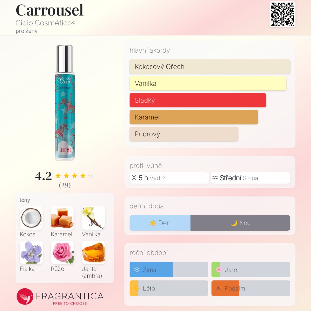 Carrousel podle Ciclo Cosméticos je Orientální vůně pro ženy. Carrousel byl/a uveden/a v roce 2019. "Nosem" za touto vůní je Luciana Bergamasco. Vrchní tóny jsou Kokos, Broskev, Mandarinka, Švestka a Pomeranč; střední tóny jsouKaramel, Fialka, Růže a Jasmín ; základní tóny jsou Vanilka, Jantar (ambra) a Santalové dřevo.