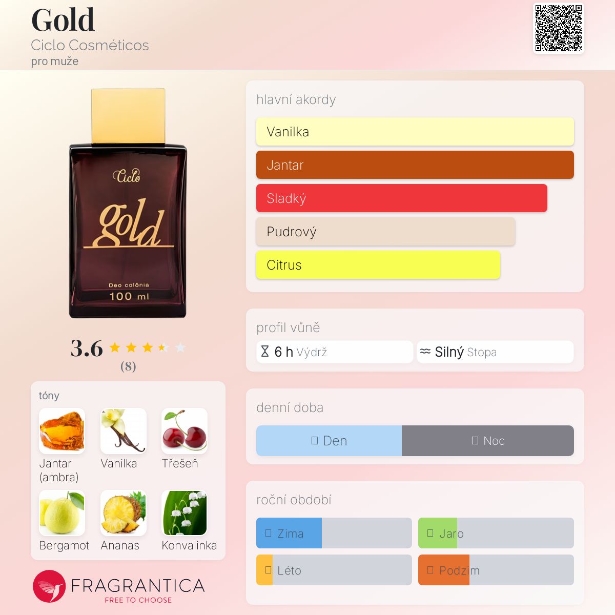 Gold podle Ciclo Cosméticos je Orientální vůně pro muže. Gold byl/a uveden/a v roce 2017. Vrchní tóny jsou Třešeň, Bergamot a Ananas; střední tóny jsouKonvalinka, Frézie a Neroli ; základní tóny jsou Jantar (ambra), Vanilka a Pižmo.