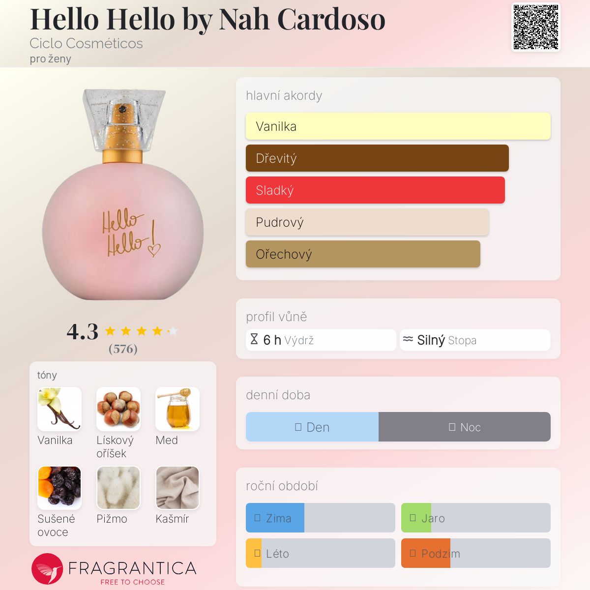 Hello Hello by Nah Cardoso podle Ciclo Cosméticos je Floral Fruity vůně pro ženy. Hello Hello by Nah Cardoso byl/a uveden/a v roce 2019. "Nosem" za touto vůní je Luciana Bergamasco. Vrchní tóny jsou Sušené ovoce, Pomeranč a Mandarinka; střední tóny jsouMed, Jasmín, Tuberóza, Pomerančový květ a Růže ; základní tóny jsou Vanilka, Lískový oříšek, Pižmo, Kašmír a Santalové dřevo.