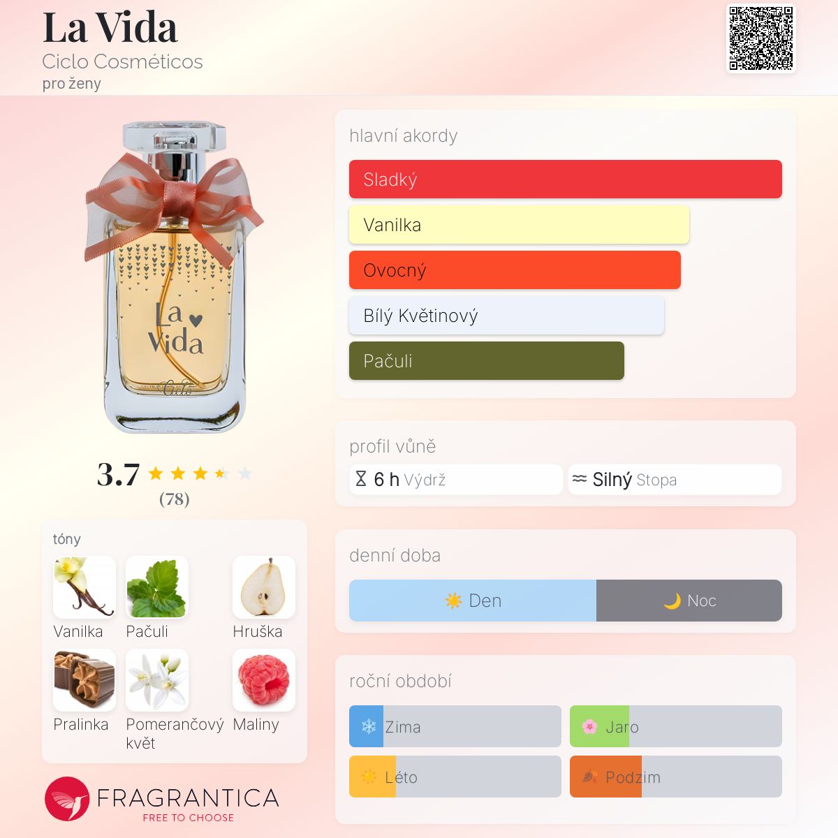 La Vida podle Ciclo Cosméticos je Floral Fruity Gourmand vůně pro ženy. La Vida byl/a uveden/a v roce 2016. Vrchní tóny jsou Hruška, Maliny a Černý rybíz; střední tóny jsouPomerančový květ, Jasmín a Kosatec ; základní tóny jsou Vanilka, Pačuli, Pralinka a Fazole tonka.