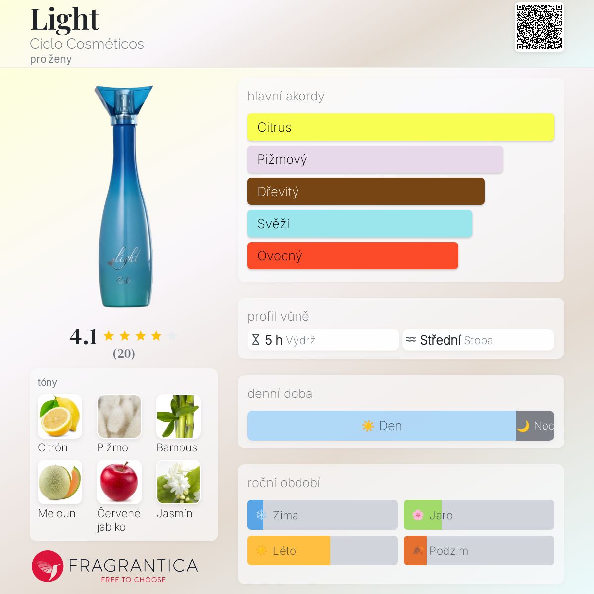 Light podle Ciclo Cosméticos je Citrus vůně pro ženy. Light byl/a uveden/a v roce 2018. Vrchní tóny jsou Sicilský citron, Bambus, Meloun a Červené jablko; střední tóny jsouJasmín a Bílá růže ; základní tóny jsou Pižmo, Cedr a Jantar (ambra).