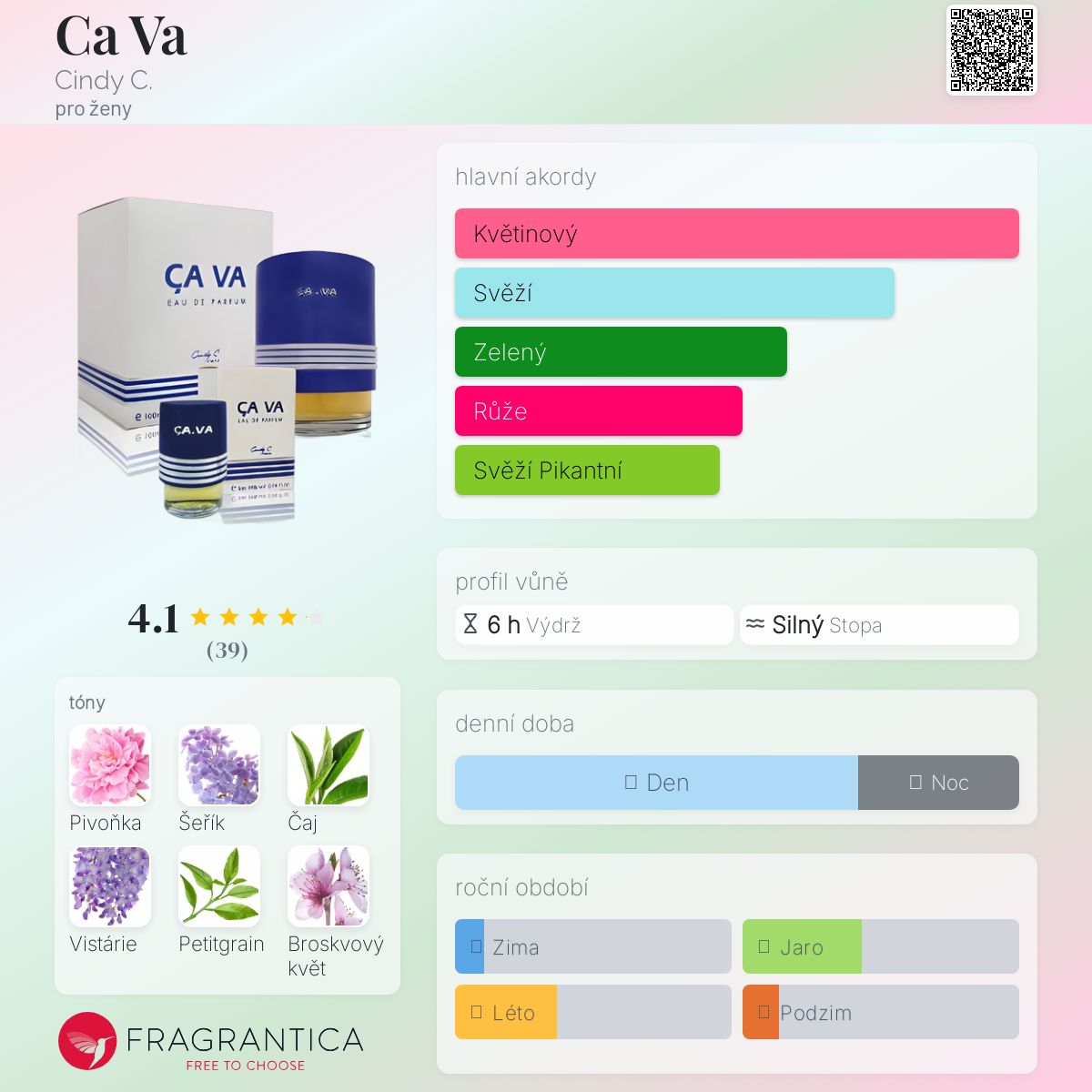 Ca Va podle Cindy C. je Floral Green vůně pro ženy. Vrchní tóny jsou Zelený šeřík a Citronový list; střední tóny jsouČervená pivoňka, Zelený čaj, Vistárie a Broskvový květ ; základní tóny jsou Cedr a Jantar (ambra).