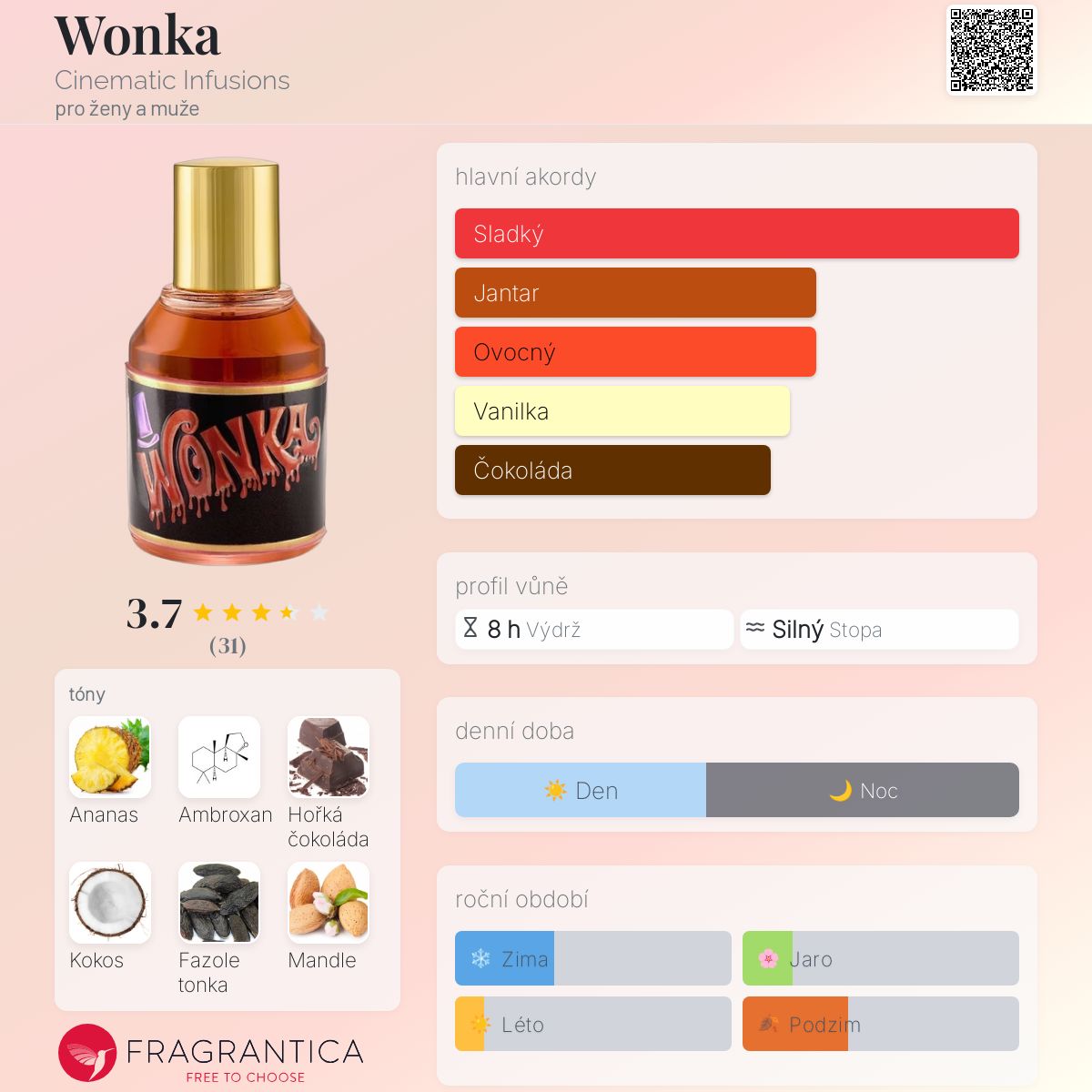 Wonka podle Cinematic Infusions je Orientální Vanilla vůně pro ženy a muže. Wonka byl/a uveden/a v roce 2022. "Nosem" za touto vůní je Maximiliano Cifuentes. Vrchní tóny jsou Ananas, Cukrová vata a Bergamot; střední tóny jsouKokos, Mandle, Pralinka a Karamel ; základní tóny jsou Ambroxan, Hořká čokoláda, Fazole tonka, Vanilka a Bílá čokoláda.