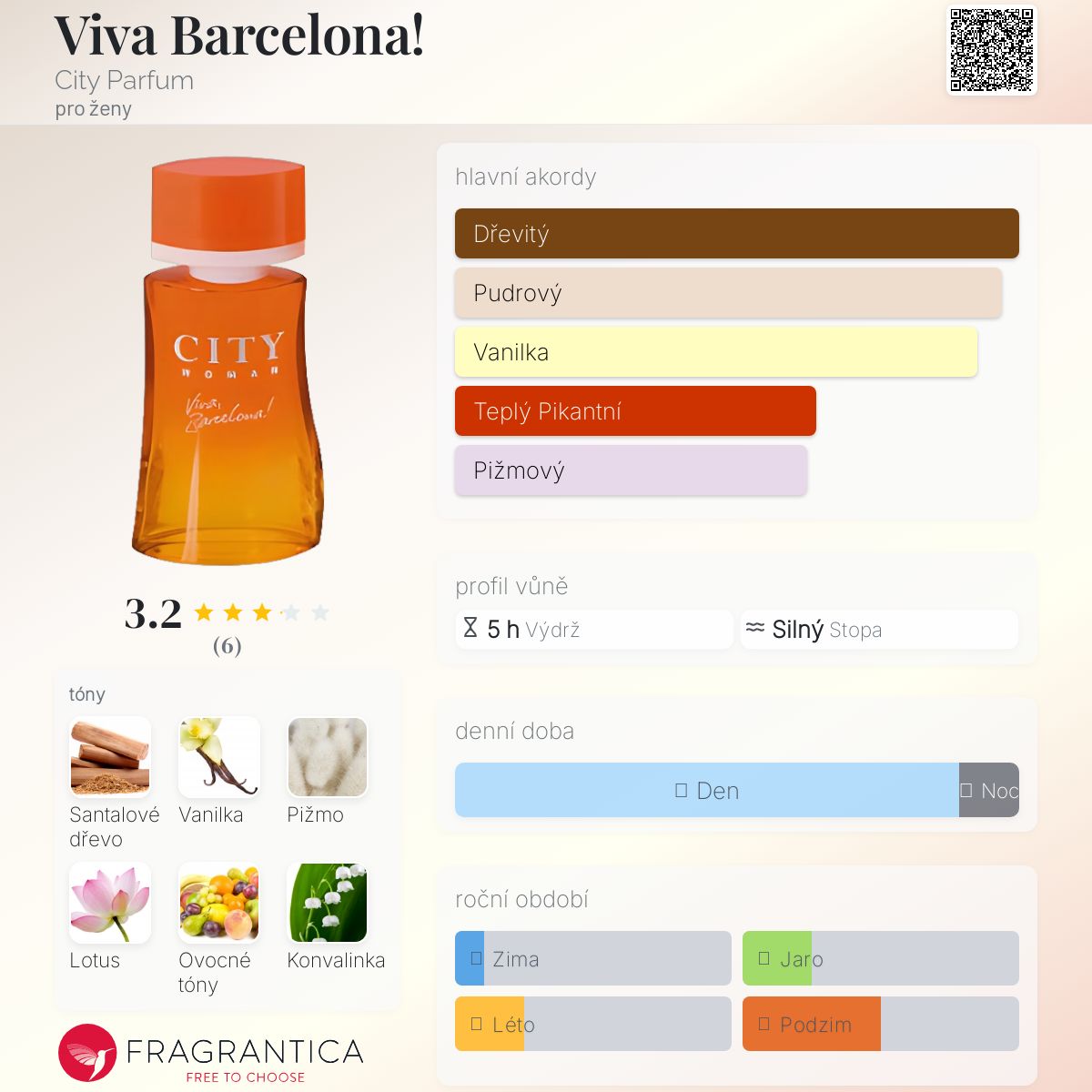 Viva Barcelona! podle City Parfum je Floral Fruity vůně pro ženy. Vrchní tón je Květinové ovocné tóny ; střední tóny jsouLotus a Konvalinka ; základní tóny jsou Santalové dřevo, Vanilka a Pižmo.