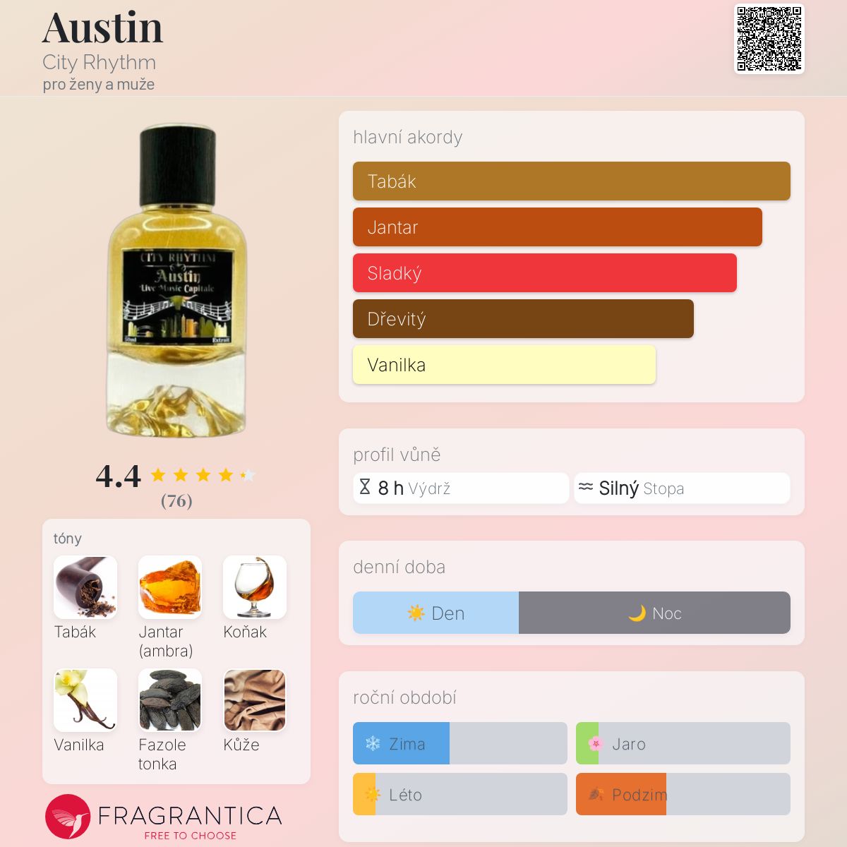 Austin podle City Rhythm je Woody vůně pro ženy a muže. Austin byl/a uveden/a v roce 2023. Vrchní tóny jsou Tabák a Koňak; střední tóny jsouFazole tonka, Kůže a Dub ; základní tóny jsou Jantar (ambra), Vanilka, Santalové dřevo a Pižmo.