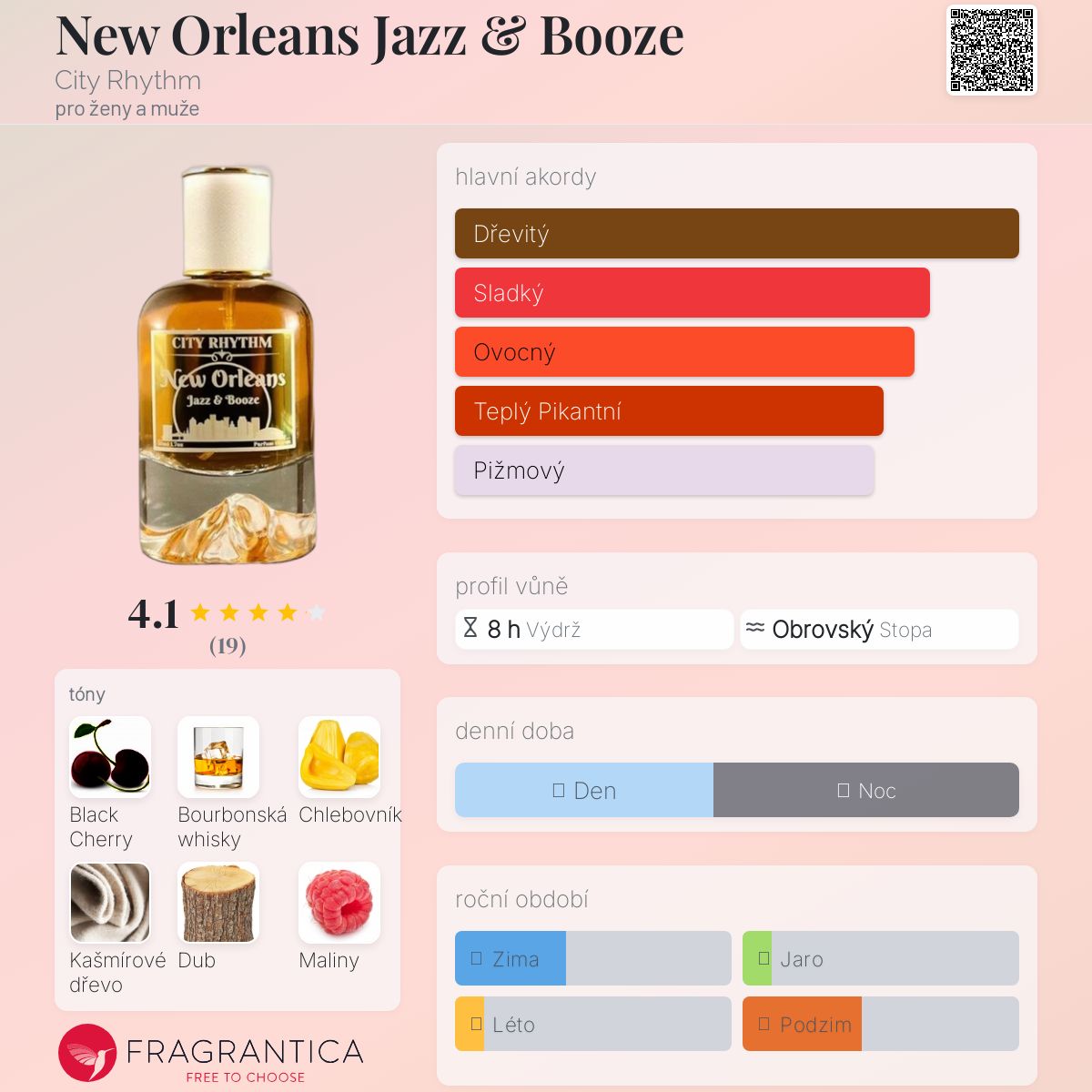 New Orleans Jazz & Booze podle City Rhythm je vůně pro ženy a muže. New Orleans Jazz & Booze byl/a uveden/a v roce 2022. New Orleans Jazz & Booze byl/a vytvořen/a Isaac Hilton a Niles Ramadhin. Vrchní tóny jsou Černá třešeň, Chlebovník, Maliny, Rebarbora, Skořice, Máslo, Liči a Bergamot; střední tóny jsouKašmírové dřevo, Dub, Fazole tonka, Chléb, Pralinka, Tabák, Bulharská růže, Pepř a Pelargónie ; základní tóny jsou Bourbonská whisky, Ambrette (přírodní pižmo), Vanilka, Pižmo, Santalové dřevo, Mech, Jantar (ambra), Pačuli a Vetiver.