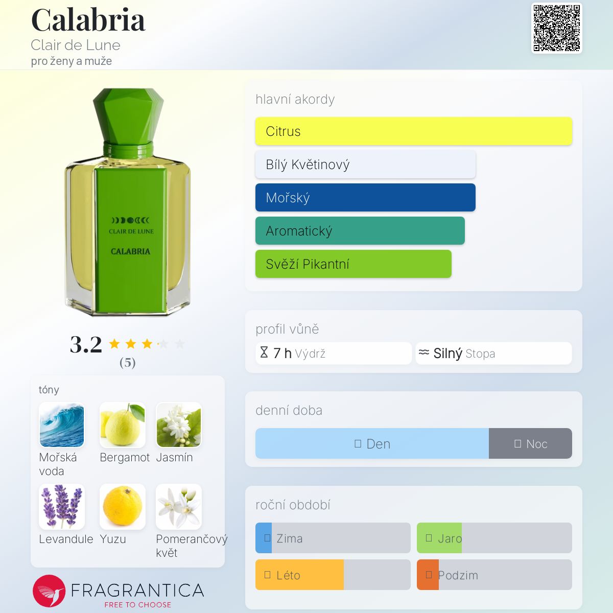Calabria podle Clair de Lune je vůně pro ženy a muže. Toto je nová vůně. Calabria byl/a uveden/a v roce 2024. Vrchní tóny jsou Bergamot, Grapefruit, Mandarinka, Pomeranč, Limetka, Černý rybíz a Citrón; střední tóny jsouVodní tóny, Jasmín, Levandule, Yuzu, Pomerančový květ, Kosatec, Citronová tráva, Mech a Tymián ; základní tóny jsou Cedr, Benzoin, Sporýš, Santalové dřevo, Pačuli, Vanilka, Vetiver a Pižmo.