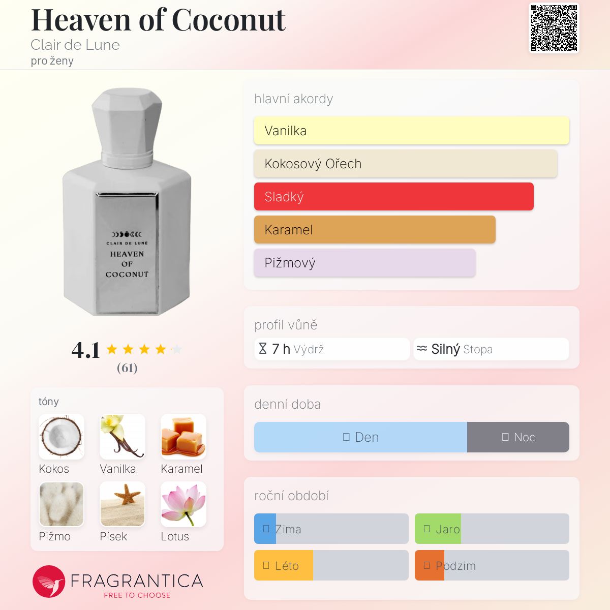 Heaven of Coconut podle Clair de Lune je Floral Fruity Gourmand vůně pro ženy. Toto je nová vůně. Heaven of Coconut byl/a uveden/a v roce 2024. Vrchní tóny jsou Kokosové mléko a Karamel; střední tóny jsouPižmo, Písek a Lotus ; základní tóny jsou Kokos, Vanilka a Konvalinka.