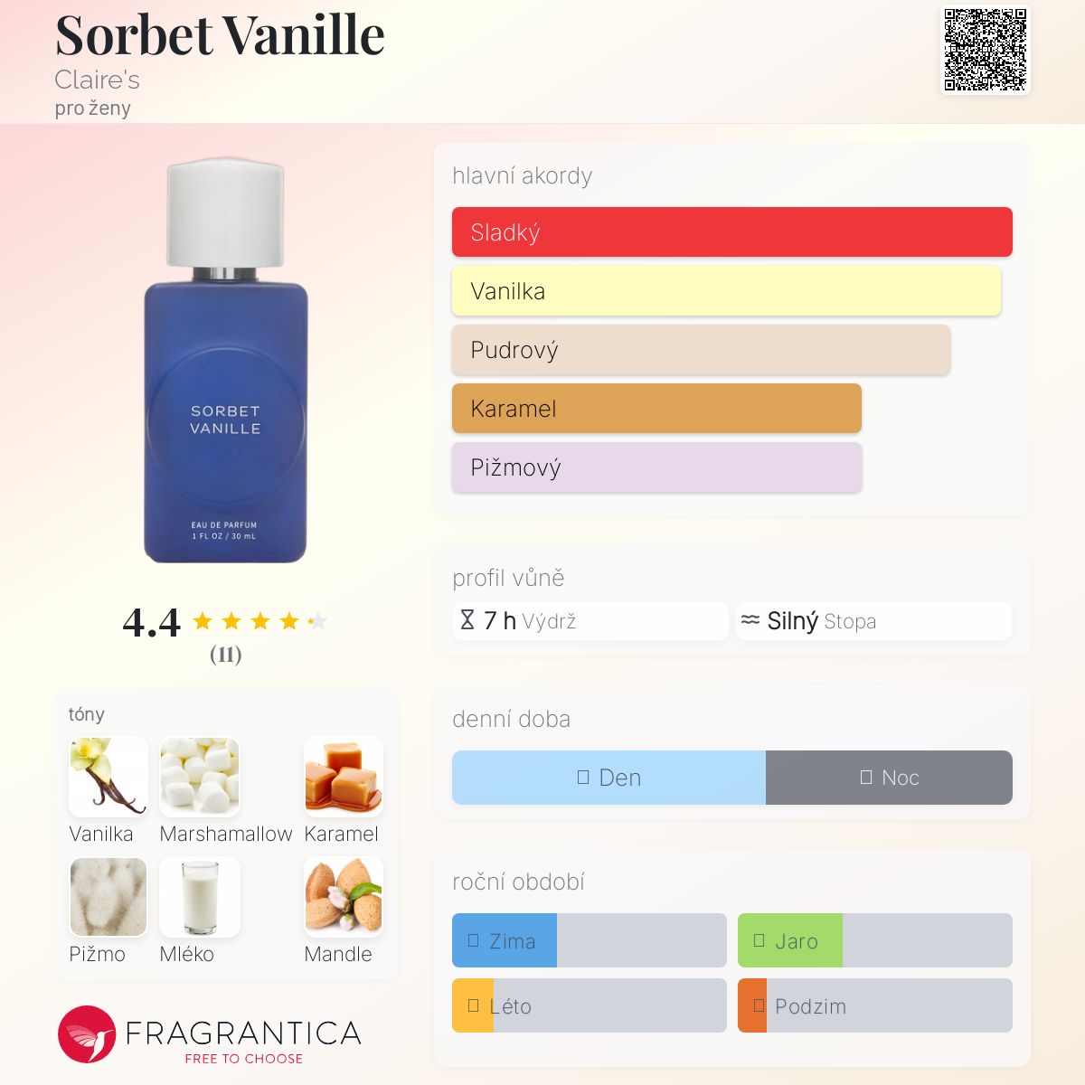 Sorbet Vanille podle Claire's je Orientální Vanilla vůně pro ženy. Sorbet Vanille byl/a uveden/a v roce 2023. Vrchní tóny jsou Vanilka, Mandle a Citrón; střední tóny jsouMarshamallow, Karamel, Mléko a Jasmín ; základní tóny jsou Vanilka, Pižmo a Cedr.