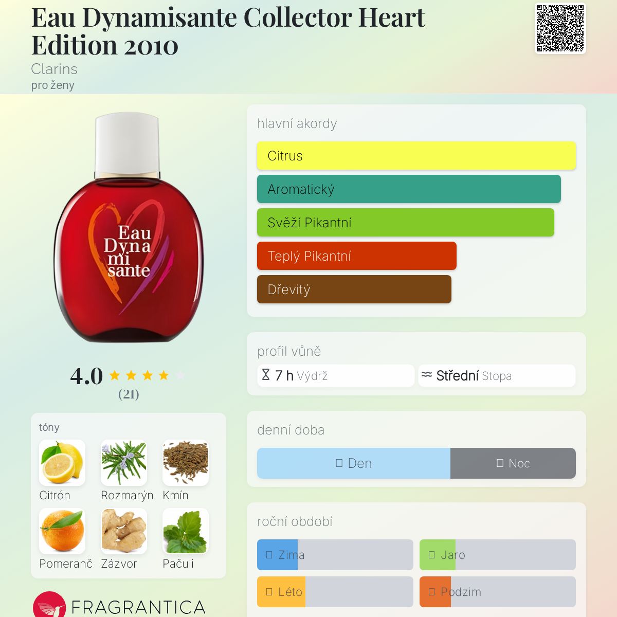 Eau Dynamisante Collector Heart Edition 2010 podle Clarins je Citrus Aromatic vůně pro ženy. Eau Dynamisante Collector Heart Edition 2010 byl/a uveden/a v roce 2010. Vrchní tóny jsou Citron amalfi , Pomeranč a Zázvor; střední tóny jsouRozmarýn a Kmín ; základní tón je Pačuli.