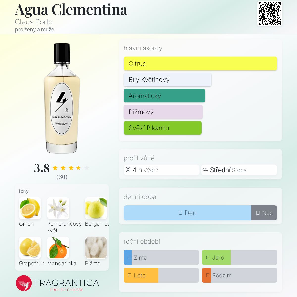 Agua Clementina podle Claus Porto je Citrus vůně pro ženy a muže. Agua Clementina byl/a uveden/a v roce 2018. "Nosem" za touto vůní je Lyn Harris. Vrchní tóny jsou Citrón, Bergamot, Grapefruit a Mandarinka; střední tóny jsouPomerančový květ a Levandule ; základní tón je Pižmo.