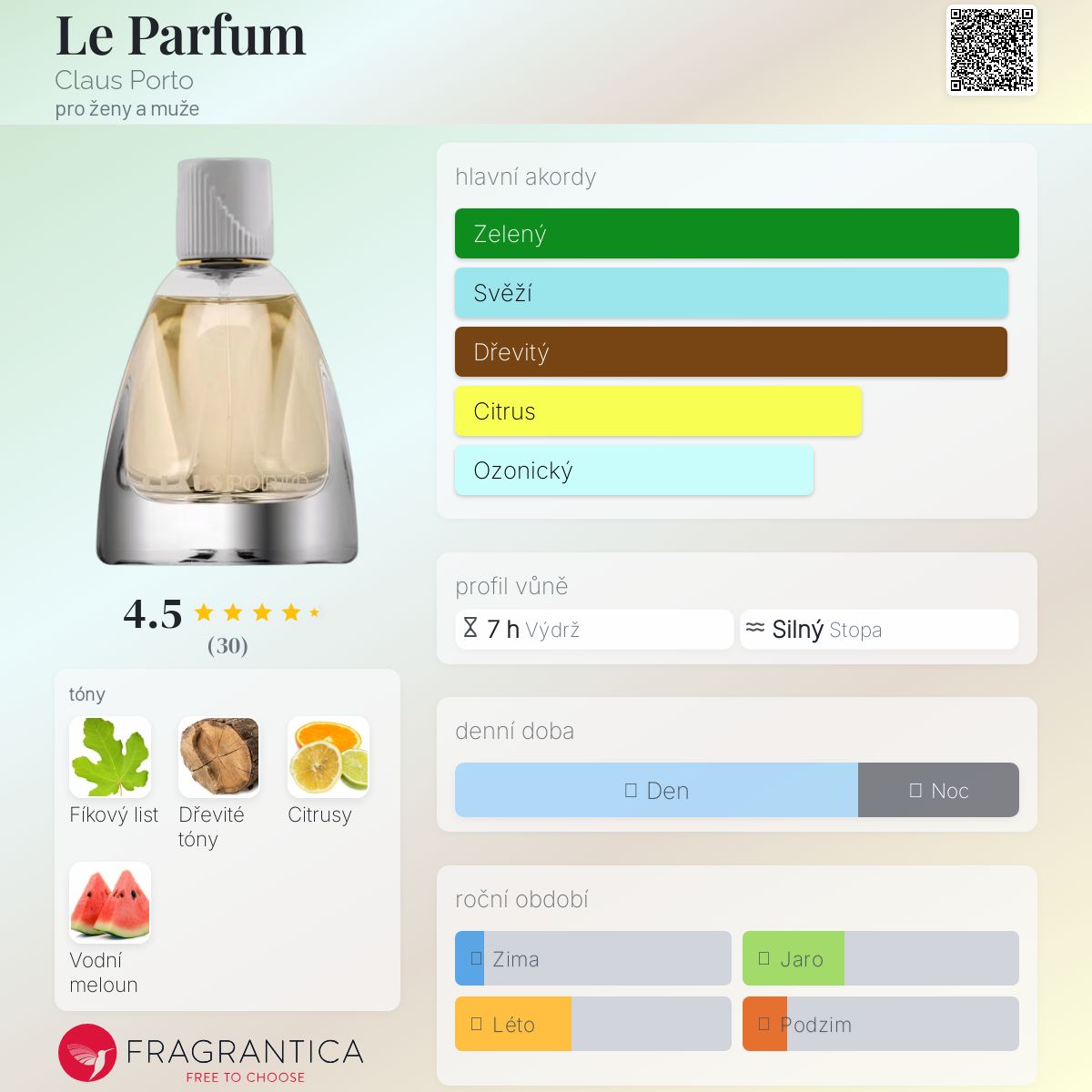 Le Parfum podle Claus Porto je Aromatic Fruity vůně pro ženy a muže. Le Parfum byl/a uveden/a v roce 2017. "Nosem" za touto vůní je Lyn Harris.