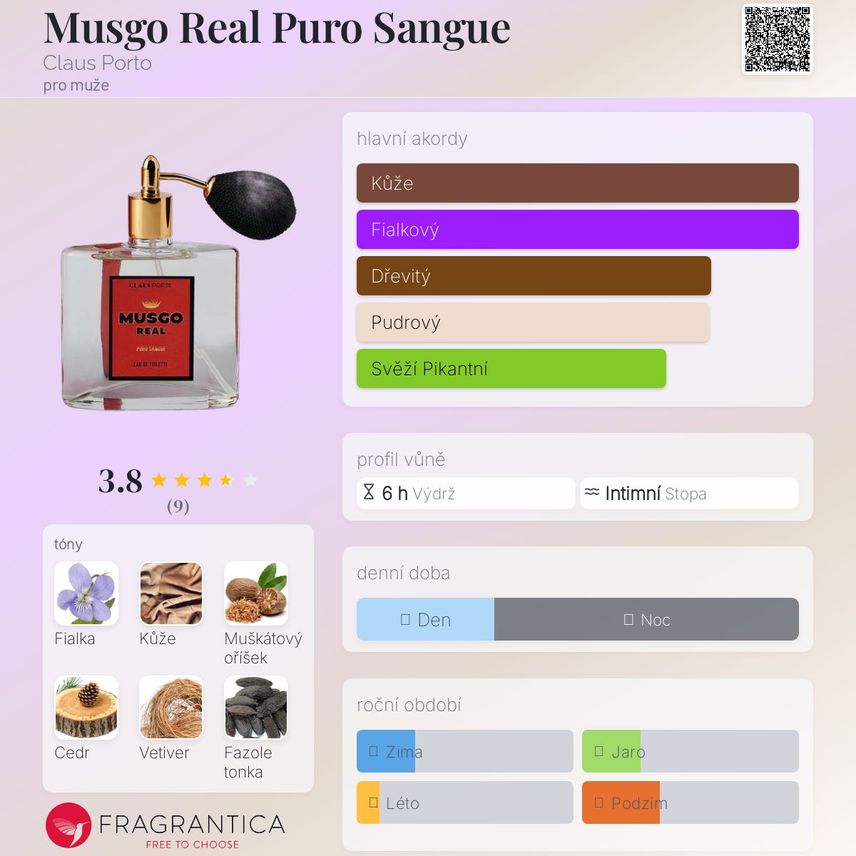 Musgo Real Puro Sangue podle Claus Porto je Leather vůně pro muže. Toto je nová vůně. Musgo Real Puro Sangue byl/a uveden/a v roce 2024. Vrchní tóny jsou Muškátový oříšek, Bergamot a Citrón; střední tóny jsouFialka, Kůže a Cedr ; základní tóny jsou Vetiver, Fazole tonka, Pačuli, Pižmo a Vanilka.