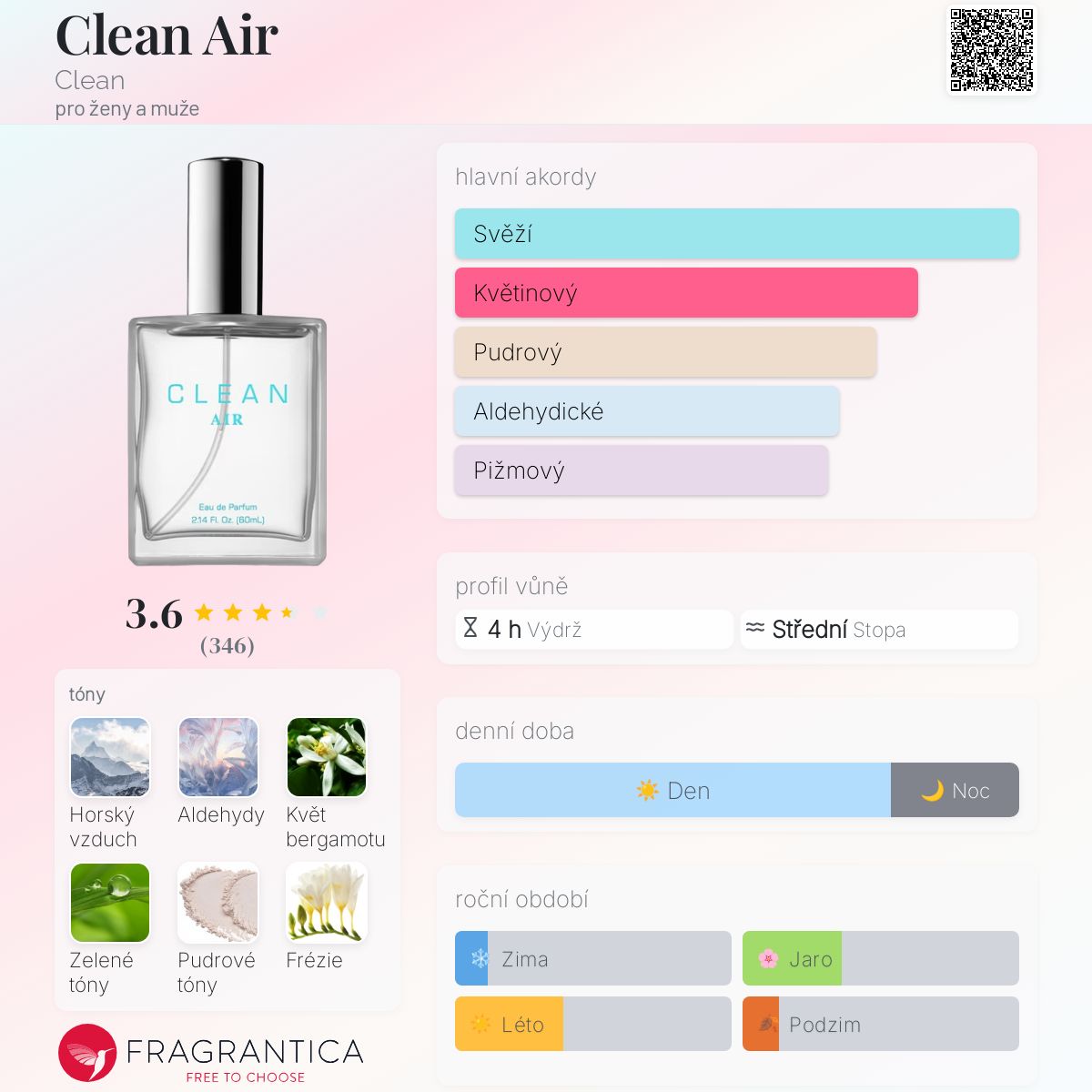 Clean Air podle Clean je Woody Aromatic vůně pro ženy a muže. Clean Air byl/a uveden/a v roce 2015. "Nosem" za touto vůní je Ruhi Patil. Vrchní tóny jsou Horský vzduch a Květ bergamotu; střední tóny jsouZelený tón, Frézie a Pivoňka ; základní tóny jsou Aldehydy, Pudrové tóny, Pižmo, Kašmírové dřevo a Bílý jantar (ambra).