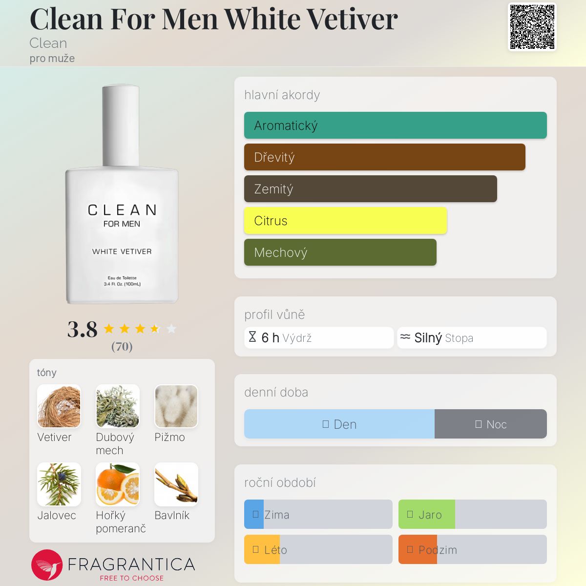 Clean For Men White Vetiver podle Clean je Woody Aromatic vůně pro muže. Clean For Men White Vetiver byl/a uveden/a v roce 2017. Vrchní tóny jsou Jalovec, Hořký pomeranč a Sicilský bergamot; střední tóny jsouVetiver, Mech a Bavlník ; základní tóny jsou Černé pižmo, Orris a Fazole tonka.