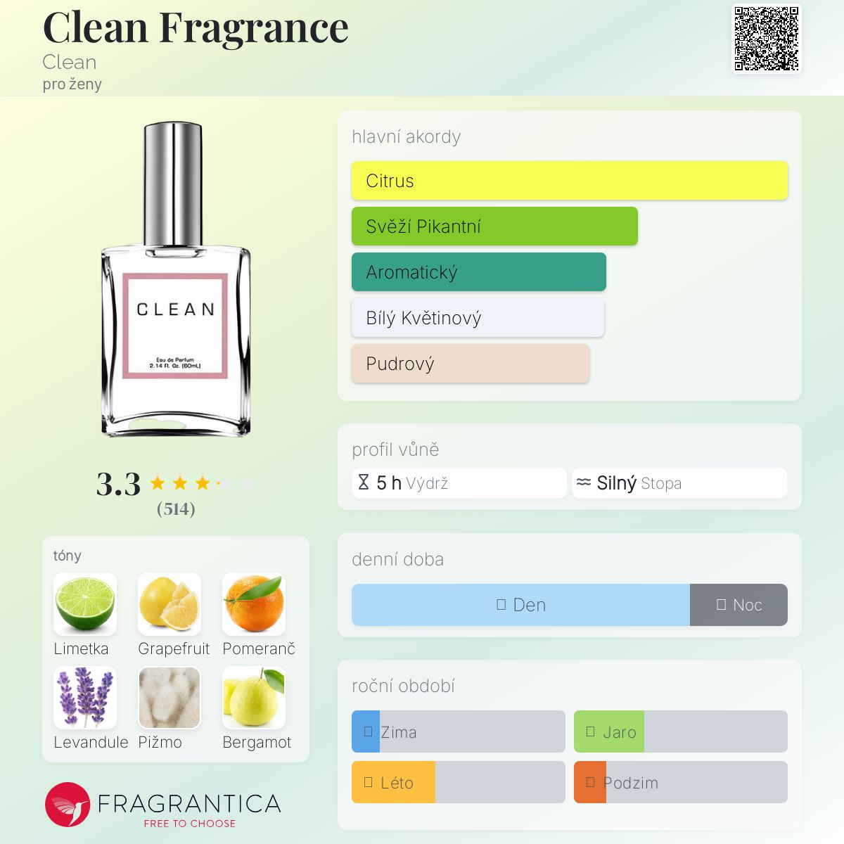 Clean Fragrance podle Clean je Floral vůně pro ženy. Clean Fragrance byl/a uveden/a v roce 2002. Vrchní tóny jsou Limetka, Růžový grapefruit, Pomeranč, Bergamot, Pomerančový květ a Lesní plody; střední tóny jsouLevandule, Lilie, Fialka, Jasmín, Mučenka a Damašská růže ; základní tóny jsou Bílé pižmo, Pelargónie a Otočník.