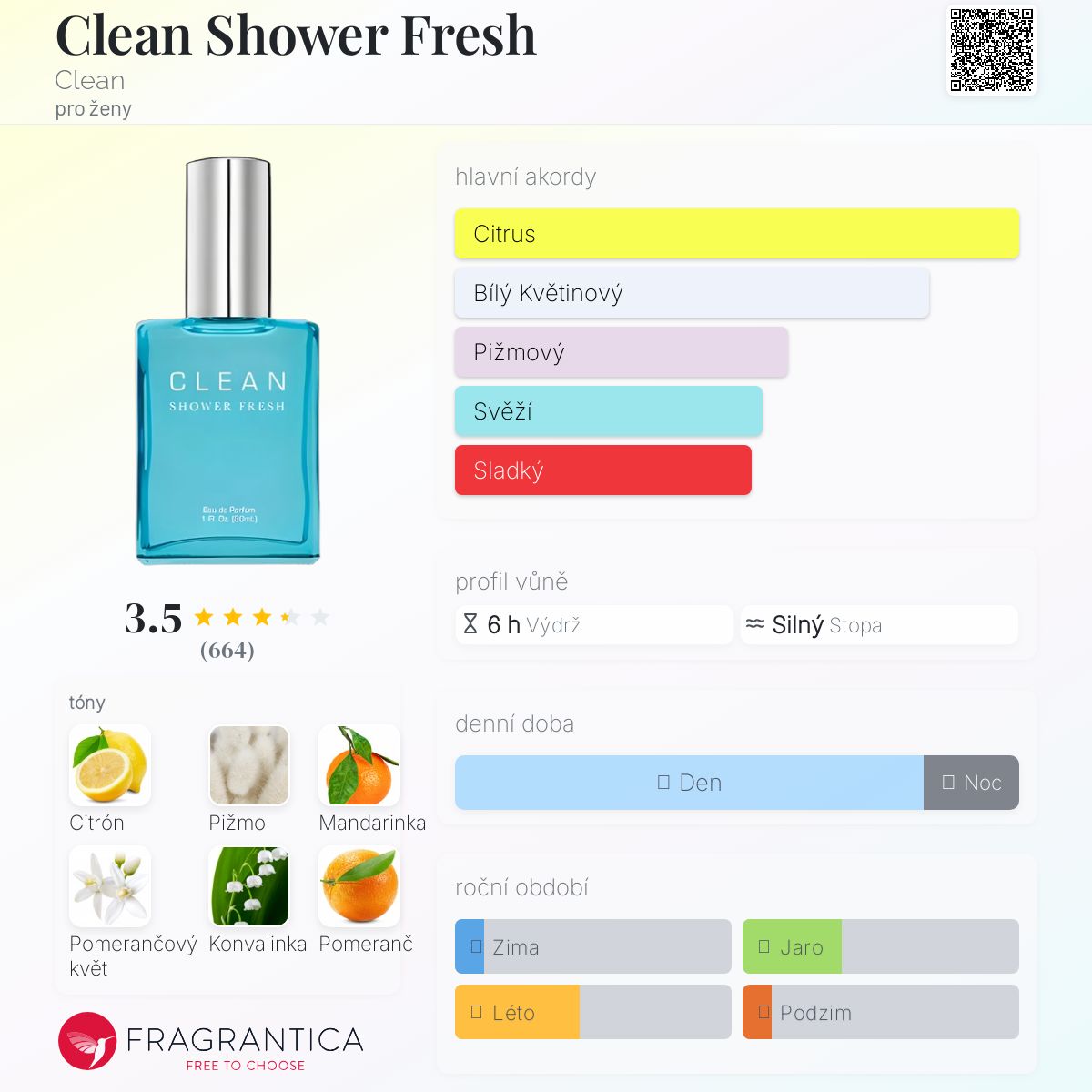 Clean Shower Fresh podle Clean je Floral vůně pro ženy. Clean Shower Fresh byl/a uveden/a v roce 2007. Vrchní tóny jsou Citrón, Mandarinka a Pomeranč; střední tóny jsouPomerančový květ, Konvalinka a Jasmín ; základní tóny jsou Pižmo a Dřevité tóny.