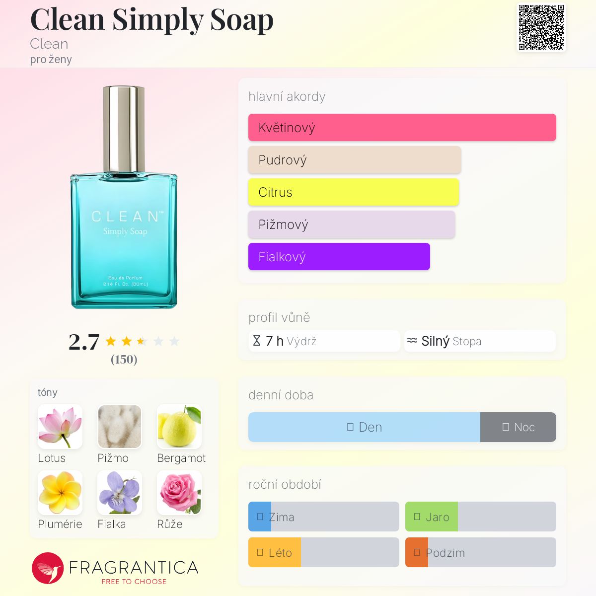Clean Simply Soap podle Clean je Floral vůně pro ženy. Clean Simply Soap byl/a uveden/a v roce 2009. Vrchní tóny jsou Bergamot a Plumérie; střední tóny jsouLotus, Fialka a Růže ; základní tón je Pižmo.