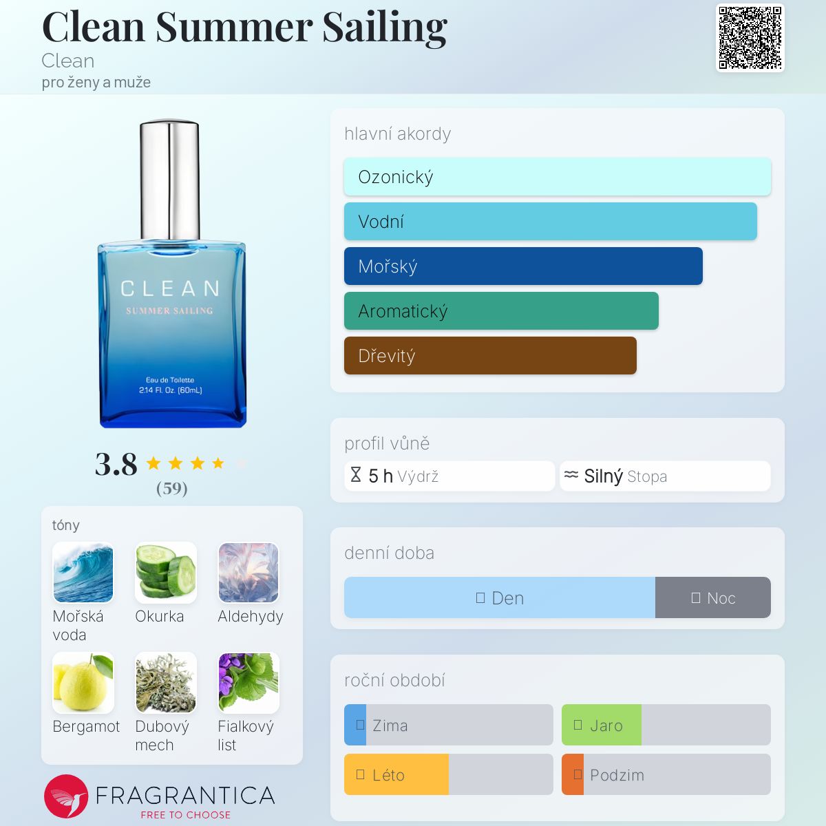 Clean Summer Sailing podle Clean je Aromatic Aquatic vůně pro ženy a muže. Clean Summer Sailing byl/a uveden/a v roce 2014. "Nosem" za touto vůní je Celine Barel. Vrchní tóny jsou Okurka, Aldehydy a Sicilský bergamot; střední tóny jsouMořské tóny, Fialkový list a Calone ; základní tóny jsou Mech, Pižmo a Bílé dřevo.
