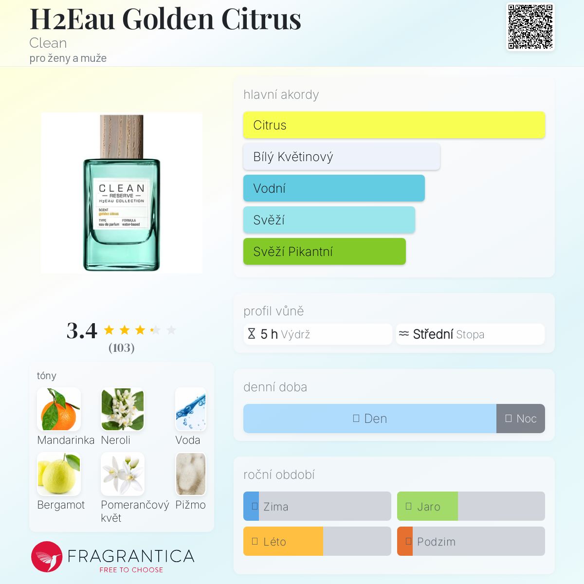 H2Eau Golden Citrus podle Clean je vůně pro ženy a muže. H2Eau Golden Citrus byl/a uveden/a v roce 2023. Vrchní tóny jsou Mandarinka, Vodní tóny a Bergamot; střední tóny jsouNeroli a Pomerančový květ ; základní tón je Pižmo.