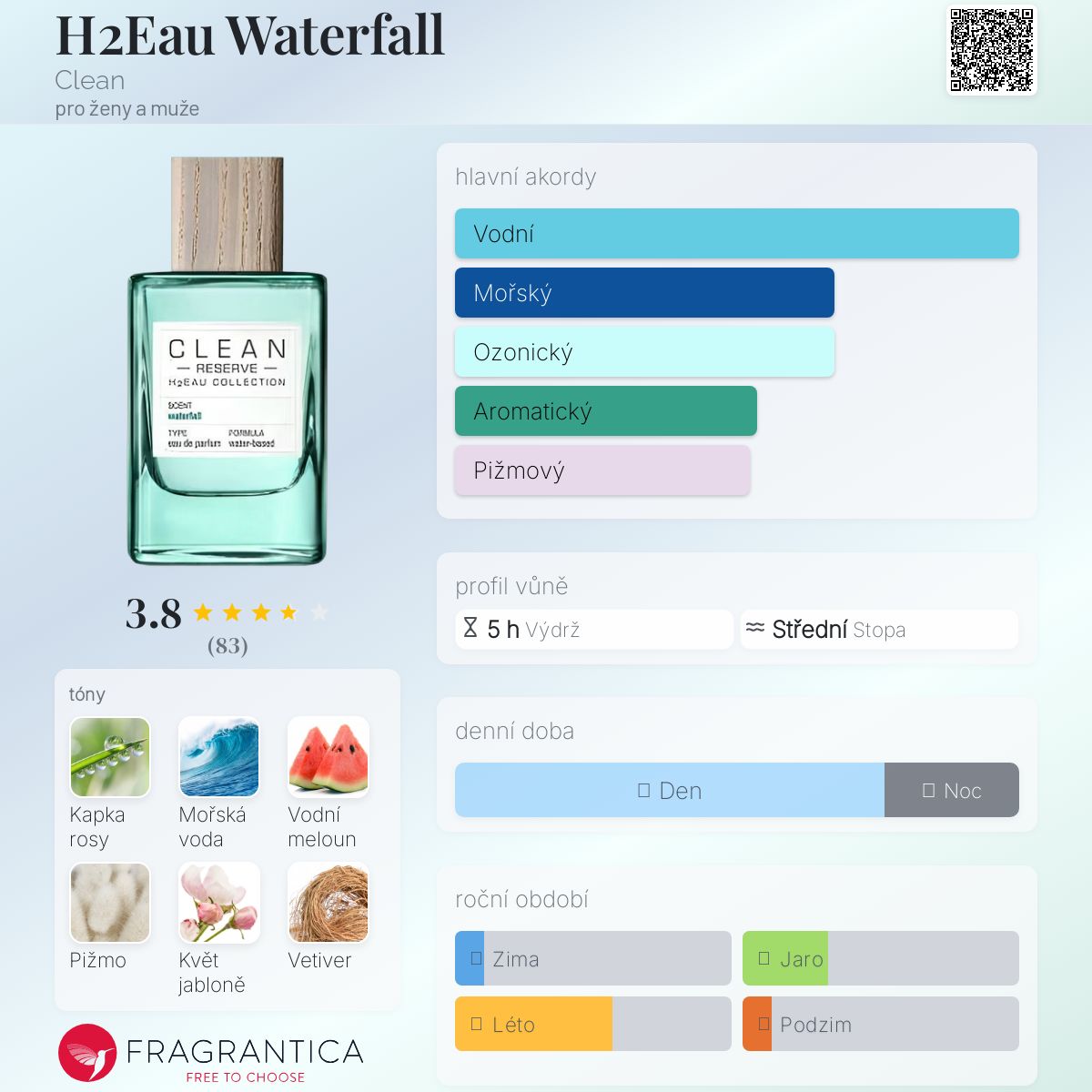 H2Eau Waterfall podle Clean je vůně pro ženy a muže. H2Eau Waterfall byl/a uveden/a v roce 2023. Vrchní tóny jsou Kapka rosy a Vodní tóny; střední tóny jsouVodní meloun a Květ jabloně ; základní tóny jsou Pižmo a Vetiver.