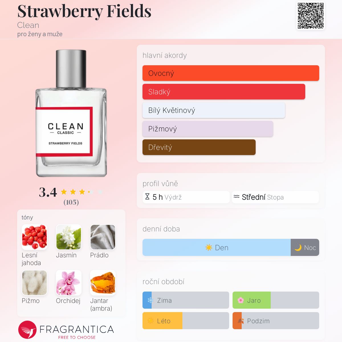 Strawberry Fields podle Clean je Floral Fruity vůně pro ženy a muže. Toto je nová vůně. Strawberry Fields byl/a uveden/a v roce 2025. Vrchní tóny jsou Lesní jahoda a Prádlo; střední tóny jsouJasmín a Orchidej ; základní tóny jsou Bílé pižmo a Jantar (ambra).