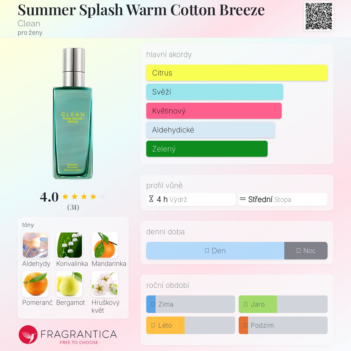 Summer Splash Warm Cotton Breeze podle Clean je Floral Aldehyde vůně pro ženy. Summer Splash Warm Cotton Breeze byl/a uveden/a v roce 2016. Vrchní tóny jsou Aldehydy, Mandarinka, Pomeranč a Bergamot; střední tóny jsouKonvalinka, Hruškový květ a Hyacint ; základní tóny jsou Pižmo, Jantar (ambra) a Bílé dřevo.