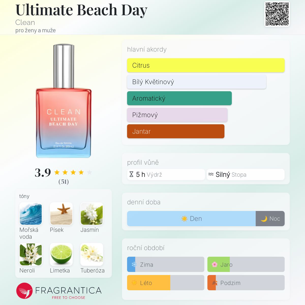 Ultimate Beach Day podle Clean je Floral Aquatic vůně pro ženy a muže. Ultimate Beach Day byl/a uveden/a v roce 2018. Vrchní tóny jsou Limetka, Bergamot, Mandarinka a Citrón; střední tóny jsouMořské tóny, Jasmín, Neroli, Tuberóza, Andělika, Bílá růže, Pomerančový květ a Levandule ; základní tóny jsou Písek, Jantar (ambra) a Pižmo.