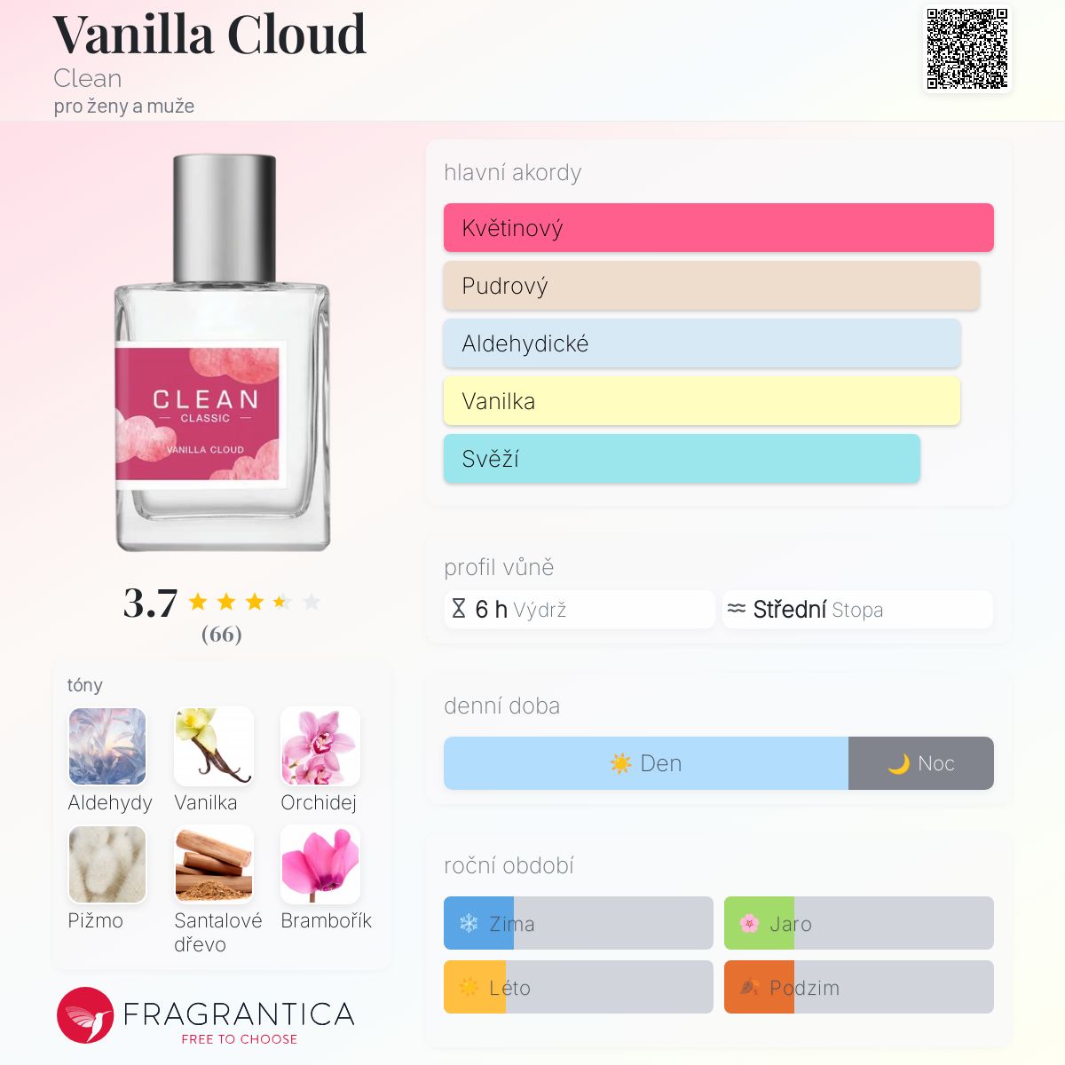 Vanilla Cloud podle Clean je Floral Aldehyde vůně pro ženy a muže. Toto je nová vůně. Vanilla Cloud byl/a uveden/a v roce 2024. Vrchní tóny jsou Aldehydy, Vanilková orchidej a Bergamot; střední tóny jsouBrambořík, Frézie, Hruška a Kapka rosy ; základní tóny jsou Vanilka, Pižmo a Santalové dřevo.