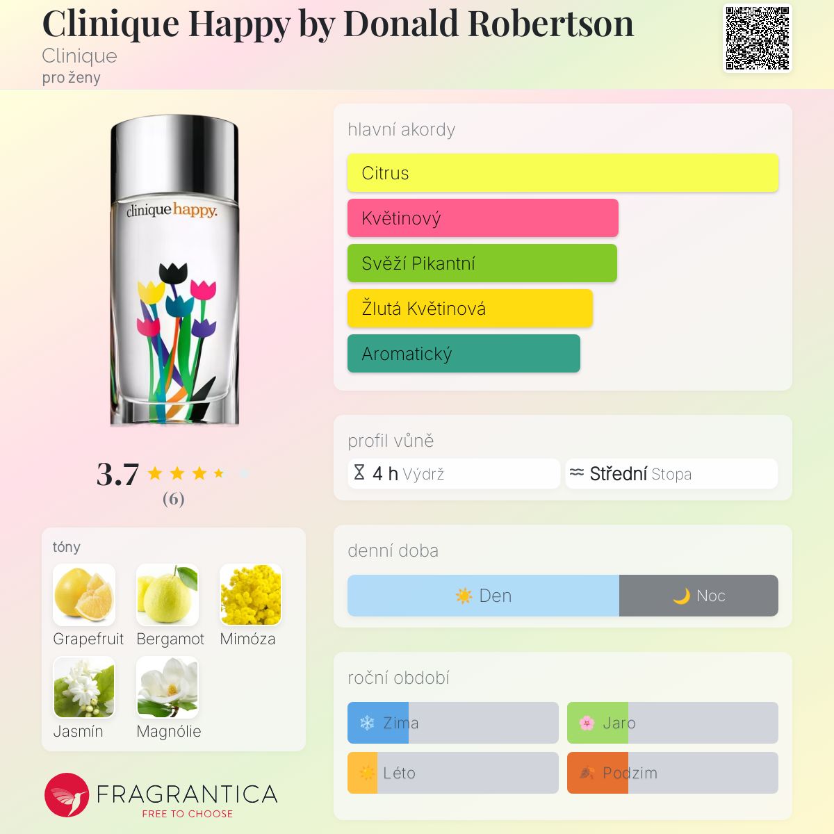 Clinique Happy by Donald Robertson podle Clinique je vůně pro ženy. Clinique Happy by Donald Robertson byl/a uveden/a v roce 2022. Vrchní tóny jsou Krvavý grep a Bergamot; střední tóny jsouMimóza a Havajský jasmín ; základní tón je Okvětní lístky mólagnie.
