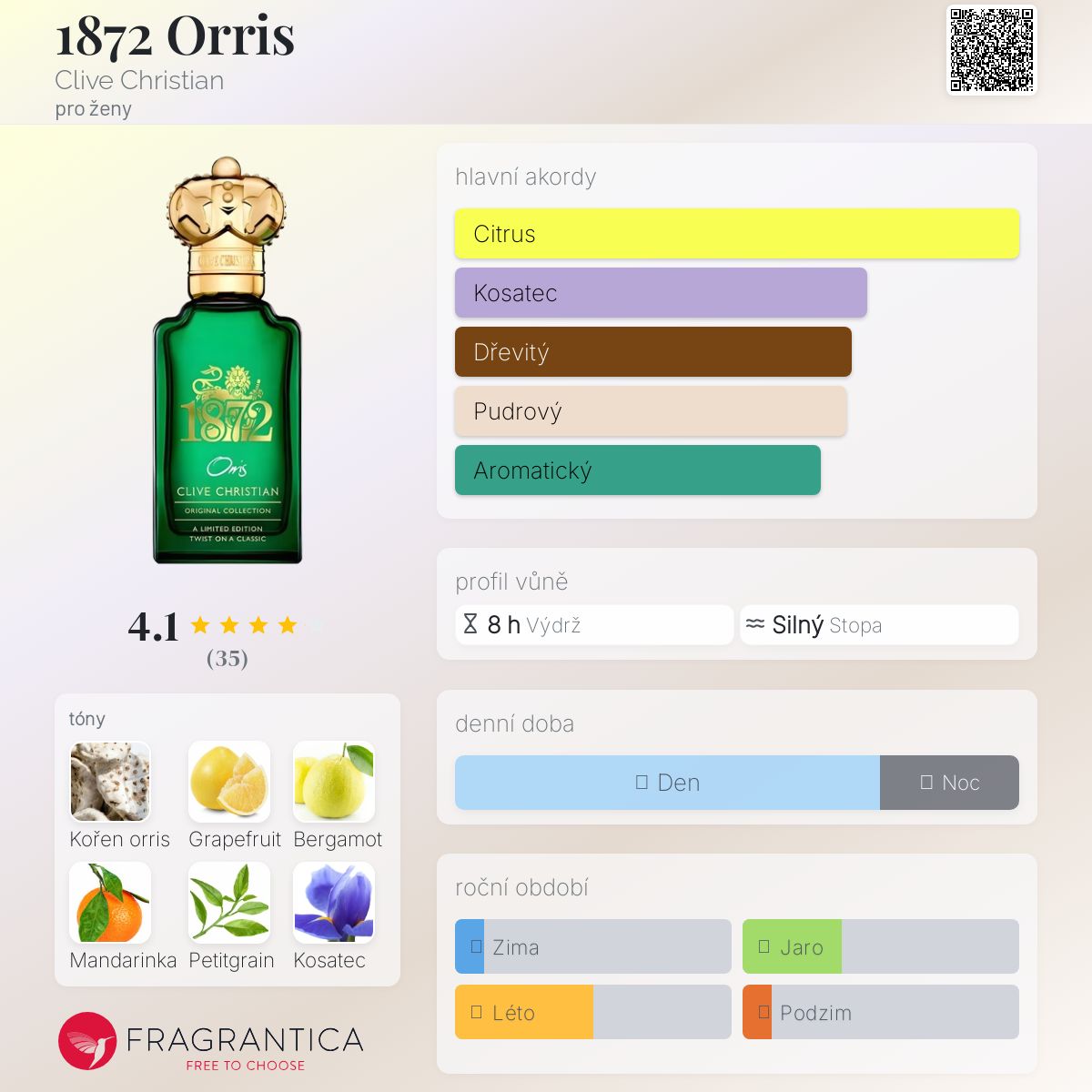 1872 Orris podle Clive Christian je Floral Woody Musk vůně pro ženy. 1872 Orris byl/a uveden/a v roce 2017. Vrchní tóny jsou Grapefruit, Bergamot, Mandarinka a Petitgrain; střední tóny jsouKosatec, Magnólie, Růže, Švestka, Jasmín a Třešňový květ ; základní tóny jsou Orris, Vetiver, Santalové dřevo, Jantar (ambra), Fazole tonka, Pižmo a Kadidlo.