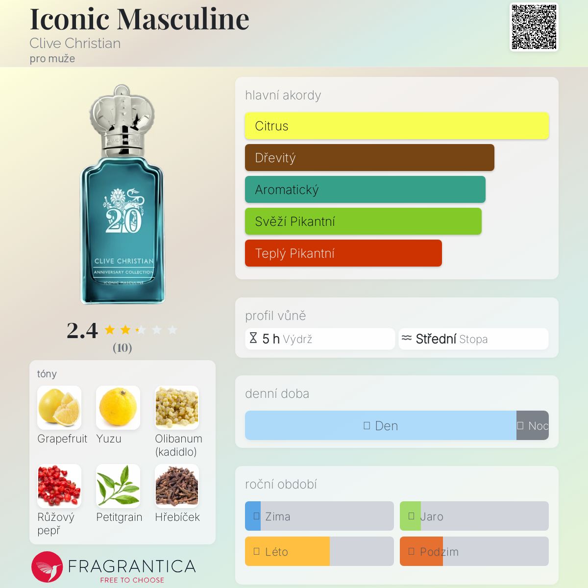 Iconic Masculine podle Clive Christian je Citrus Aromatic vůně pro muže. Toto je nová vůně. Iconic Masculine byl/a uveden/a v roce 2025. Vrchní tóny jsou Grapefruit, Yuzu a Růžový pepř; střední tóny jsouPetitgrain, Hřebíček a Jalovec ; základní tóny jsou Olibanum, Cedr a Vetiver.