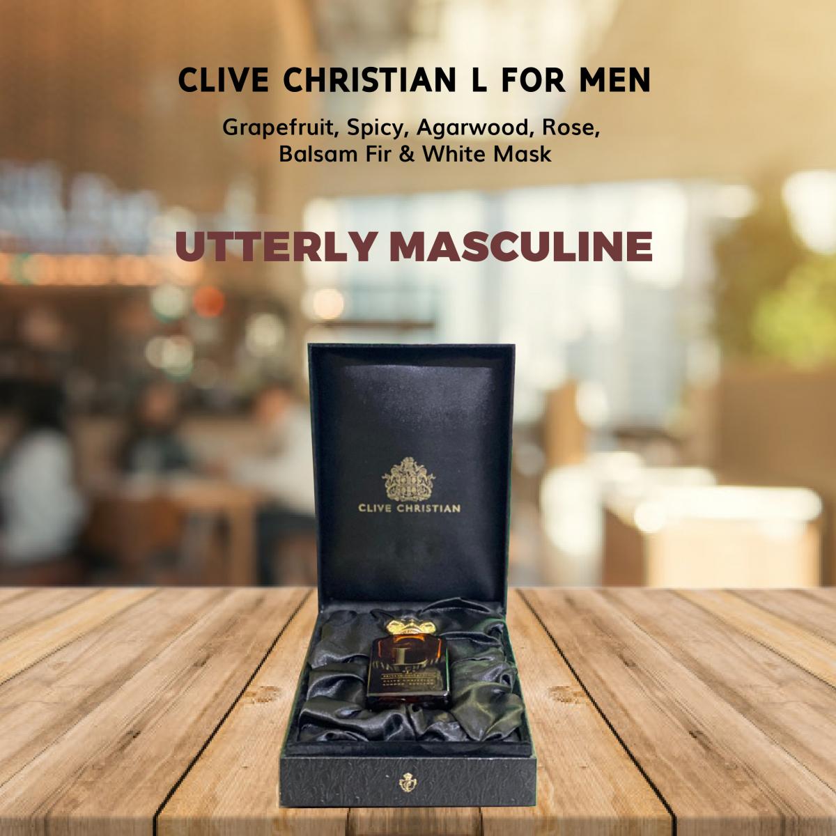 L for Men podle Clive Christian je Woody Spicy vůně pro muže. L for Men byl/a uveden/a v roce 2014. Vrchní tóny jsou Petitgrain a Grapefruit; střední tóny jsouAgarové dřevo (oud) a Růže ; základní tóny jsou Jedle balzámová, Vetiver, Atlasový cedr a Pižmo.