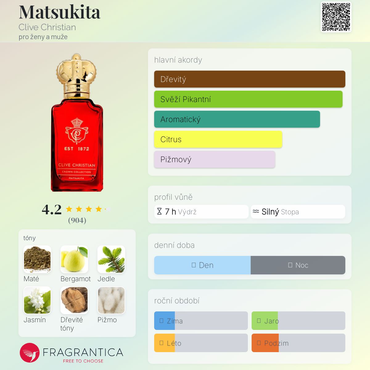 Matsukita podle Clive Christian je Woody Chypre vůně pro ženy a muže. Matsukita byl/a uveden/a v roce 2021. Vrchní tóny jsou Bergamot, Růžový pepř a Muškátový oříšek; střední tóny jsouMaté, Čínský jasmín, Jasmín Sambac a Guajakové dřevo ; základní tóny jsou Jedle balzámová, Dřevité tóny, Pižmo a Jantar (ambra).