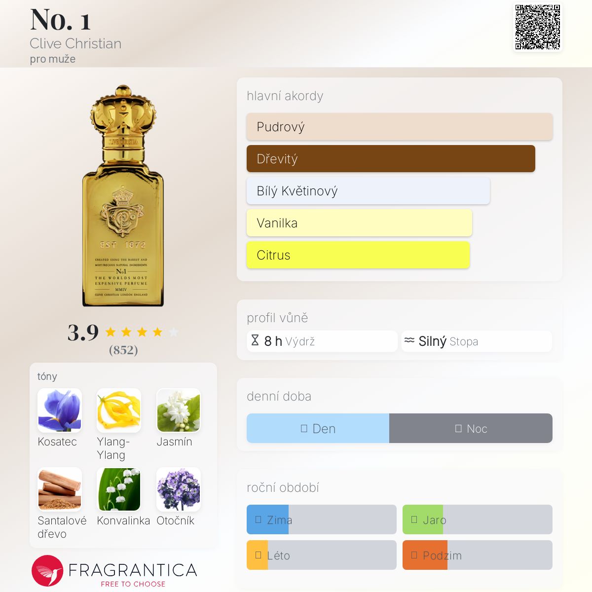 No. 1 podle Clive Christian je Orientální Woody vůně pro muže. No. 1 byl/a uveden/a v roce 2001. Vrchní tóny jsou Muškátový oříšek, Kardamom, Limetka, Mandarinka, Paprika, Pelyněk, Grapefruit a Kmín; střední tóny jsouKosatec, Ylang-Ylang, Jasmín, Konvalinka, Otočník a Růže ; základní tóny jsou Santalové dřevo, Jantar (ambra), Pižmo, Vanilka, Fazole tonka, Virginský cedr a Vetiver.