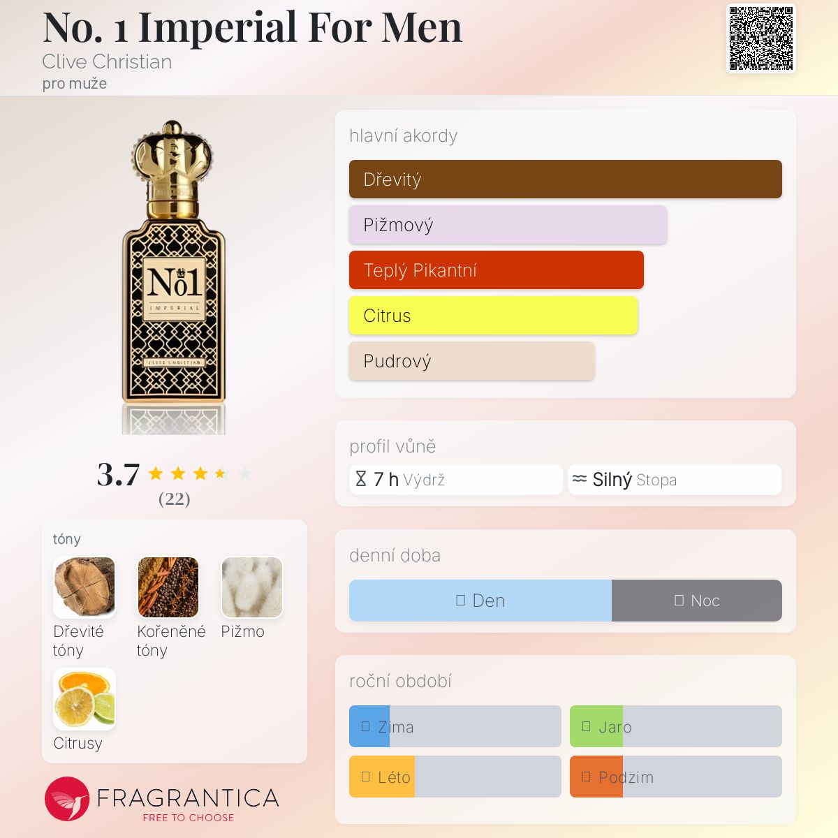 No. 1 Imperial For Men podle Clive Christian je Woody Spicy vůně pro muže. No. 1 Imperial For Men byl/a uveden/a v roce 2015. Vrchní tón je Citrusy ; střední tón jeKoření ; základní tóny jsou Dřevité tóny a Pižmo.