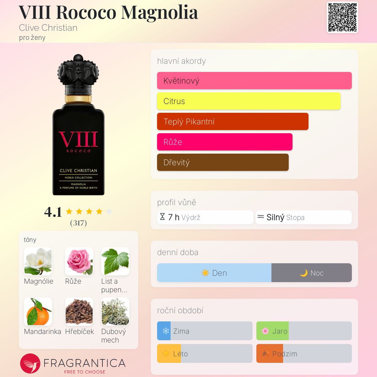 VIII Rococo Magnolia podle Clive Christian je Floral vůně pro ženy. VIII Rococo Magnolia byl/a uveden/a v roce 2017. "Nosem" za touto vůní je Angela Stavrevska. Vrchní tóny jsou Černý rybíz, Mandarinka a Bergamot; střední tóny jsouMagnólie, Růže, Hřebíček a Skořice ; základní tóny jsou Dubový mech a Santalové dřevo.