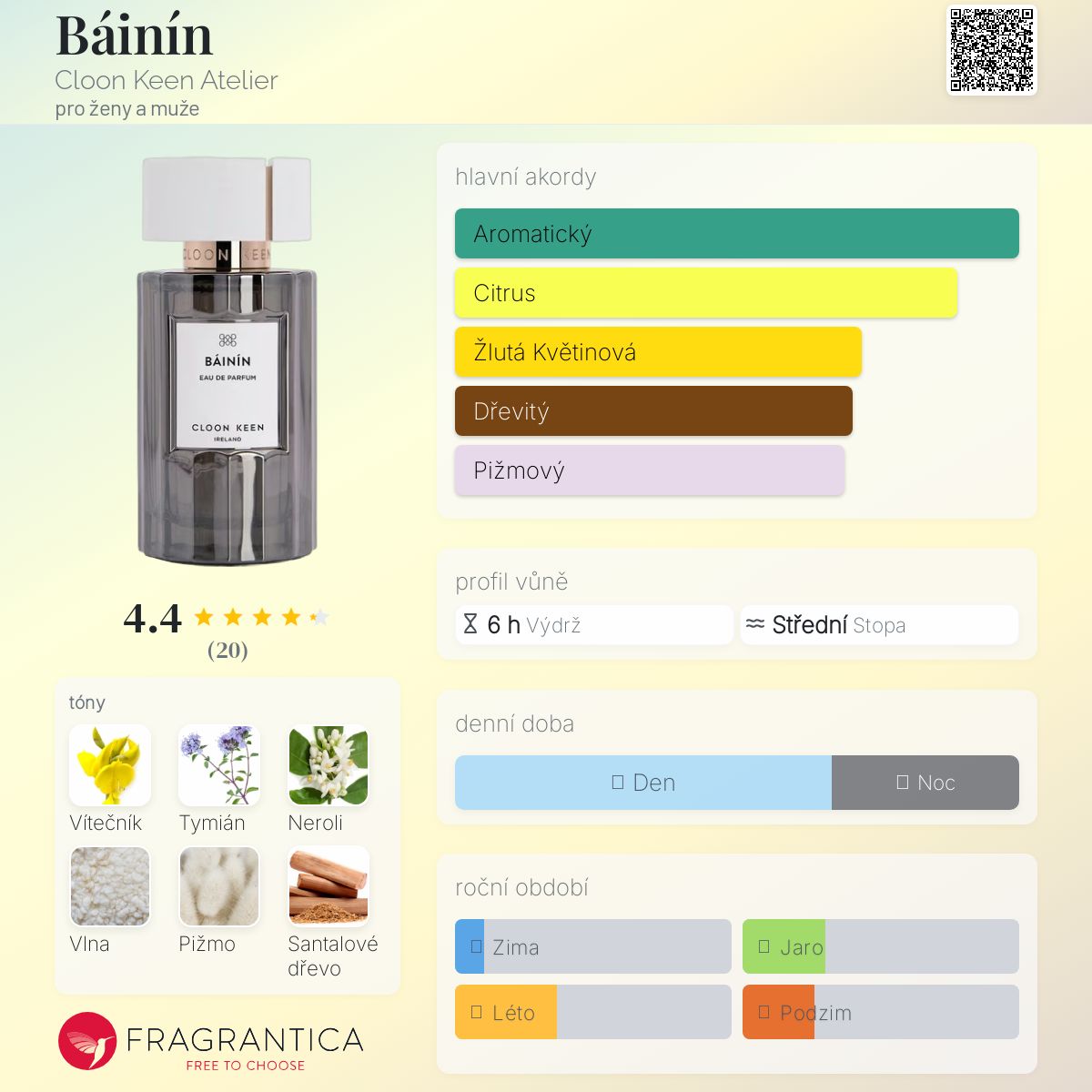 Báinín podle Cloon Keen Atelier je Chypre Floral vůně pro ženy a muže. Toto je nová vůně. Báinín byl/a uveden/a v roce 2024. Vrchní tóny jsou Tymián, Neroli, Citrón, Bergamot, Šalvěj muškátová, Mandarinka a Pikantní máta; střední tóny jsouJanovec, Vlna, Jasmín Sambac, Fialka, Hruška a Černý rybíz ; základní tóny jsou Pižmo, Santalové dřevo, Cedr a Kumarin.
