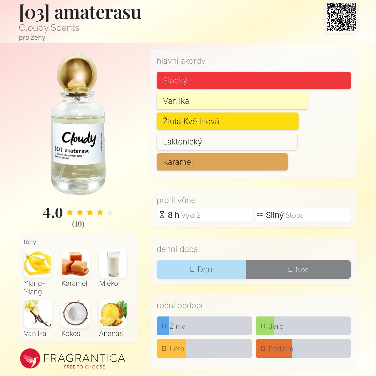 [03] amaterasu podle Cloudy Scents je Floral Fruity Gourmand vůně pro ženy. [03] amaterasu byl/a uveden/a v roce 2023. "Nosem" za touto vůní je Amadeusz Hamerski. Vrchní tóny jsou Ananas a Bergamot; střední tóny jsouYlang-Ylang, Karamel, Mléko, Kokos a Zelená tráva ; základní tóny jsou Vanilka, Mléko, Kokos, Fazole tonka a Jantar (ambra).