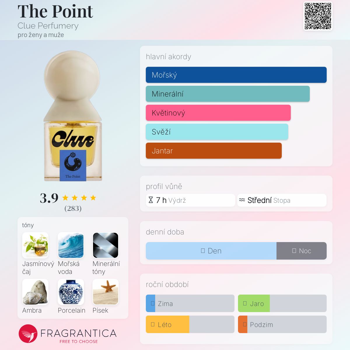 The Point podle Clue Perfumery je Floral vůně pro ženy a muže. Toto je nová vůně. The Point byl/a uveden/a v roce 2024. "Nosem" za touto vůní je Laura Oberwetter. Vrchní tóny jsou Jasmínový čaj, Minerální tóny a Porcelain; střední tóny jsouMořská voda, Med a Pačuli ; základní tóny jsou Ambra a Písek.