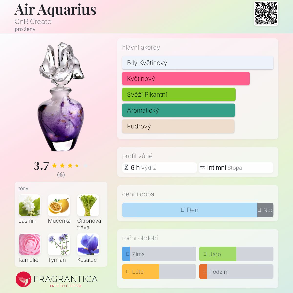 Air Aquarius podle CnR Create je Floral vůně pro ženy. Air Aquarius byl/a uveden/a v roce 2011. "Nosem" za touto vůní je Olivier Funel. Vrchní tóny jsou Mučenka, Kamélie, Lilie a Šeřík; střední tóny jsouJasmín, Citronová tráva, Tymián, Fialka, Slaměnka a Konvalinka ; základní tóny jsou Kosatec, Bobkový list a Balzám Tolu.