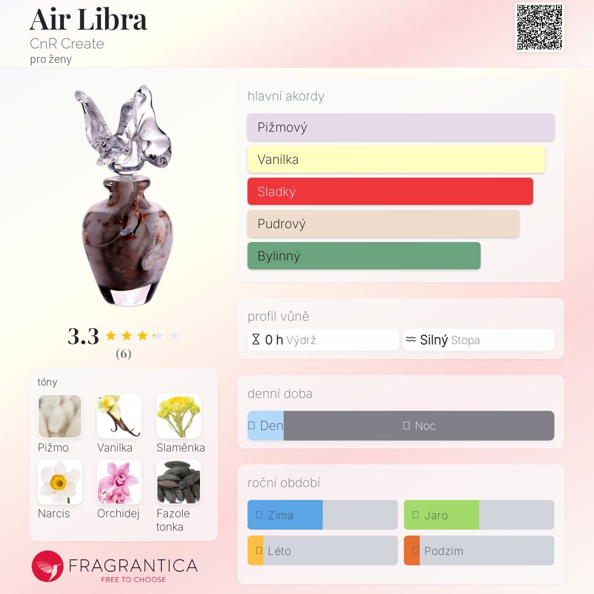 Air Libra podle CnR Create je Floral vůně pro ženy. Air Libra byl/a uveden/a v roce 2011. "Nosem" za touto vůní je Olivier Funel. Vrchní tóny jsou Orchidej, Hyacint a Brambořík; střední tóny jsouSlaměnka, Narcis, Ylang-Ylang a Citronový balzám ; základní tóny jsou Pižmo, Vanilka, Fazole tonka a Jantar (ambra).