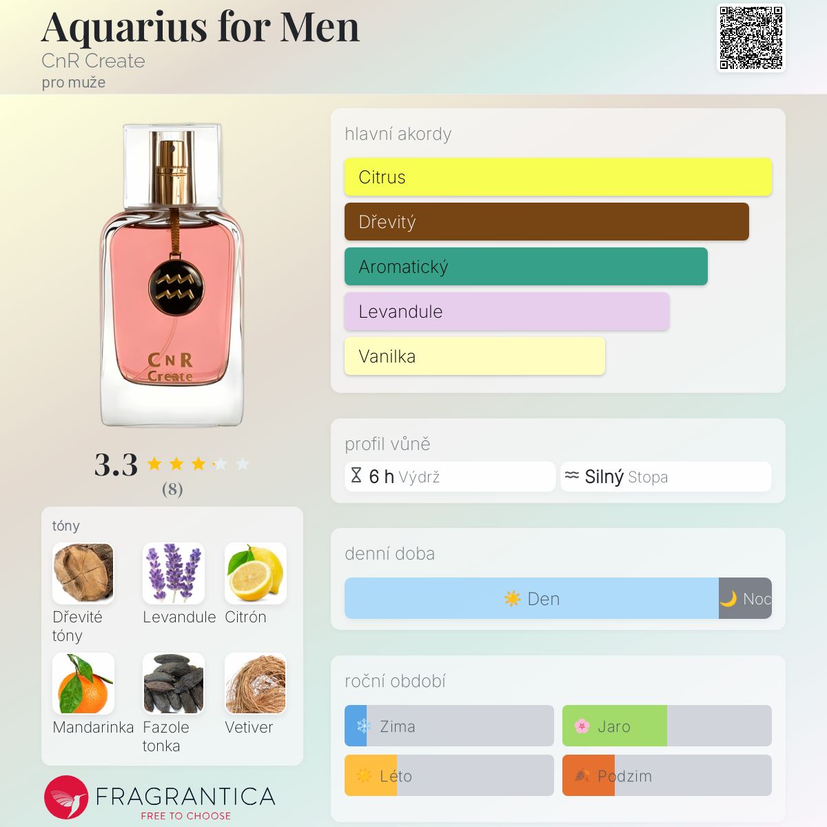 Aquarius for Men podle CnR Create je Orientální Woody vůně pro muže. Aquarius for Men byl/a uveden/a v roce 2010. "Nosem" za touto vůní je Olivier Funel. Vrchní tóny jsou Levandule, Citron amalfi a Mandarinka; střední tóny jsouDřevité tóny a Vetiver ; základní tóny jsou Fazole tonka a Pižmo.