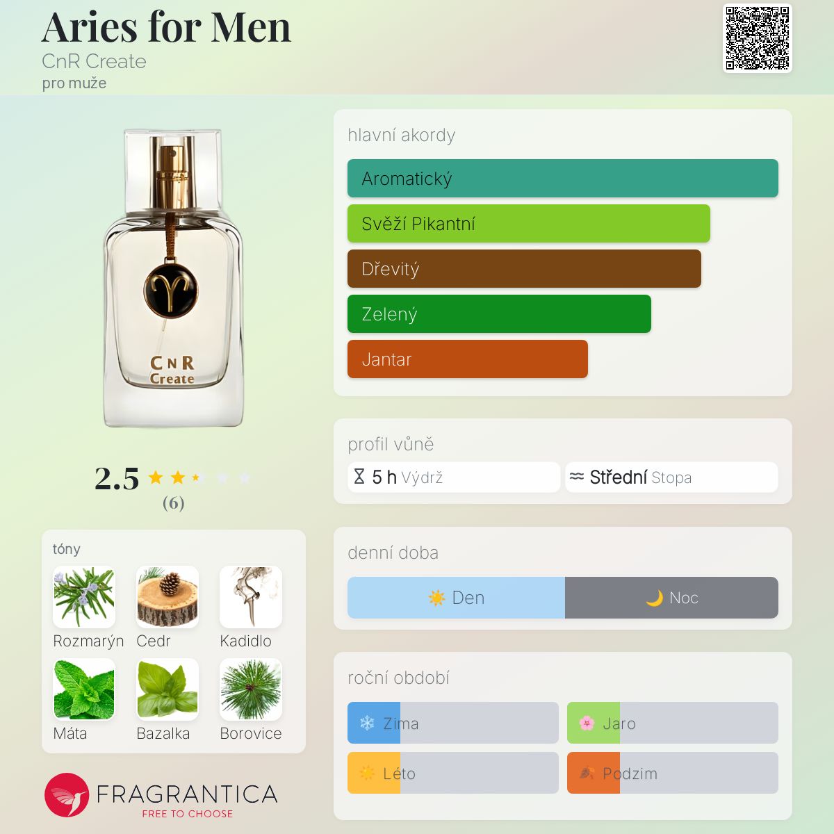 Aries for Men podle CnR Create je Woody Floral Musk vůně pro muže. Aries for Men byl/a uveden/a v roce 2010. "Nosem" za touto vůní je Olivier Funel. Vrchní tóny jsou Virginský cedr, Máta, Bazalka a Pačuli; střední tóny jsouRozmarýn, Borovice, Jasmín a Pelargónie ; základní tóny jsou Kadidlo, Vonokvětka a Galbanum.