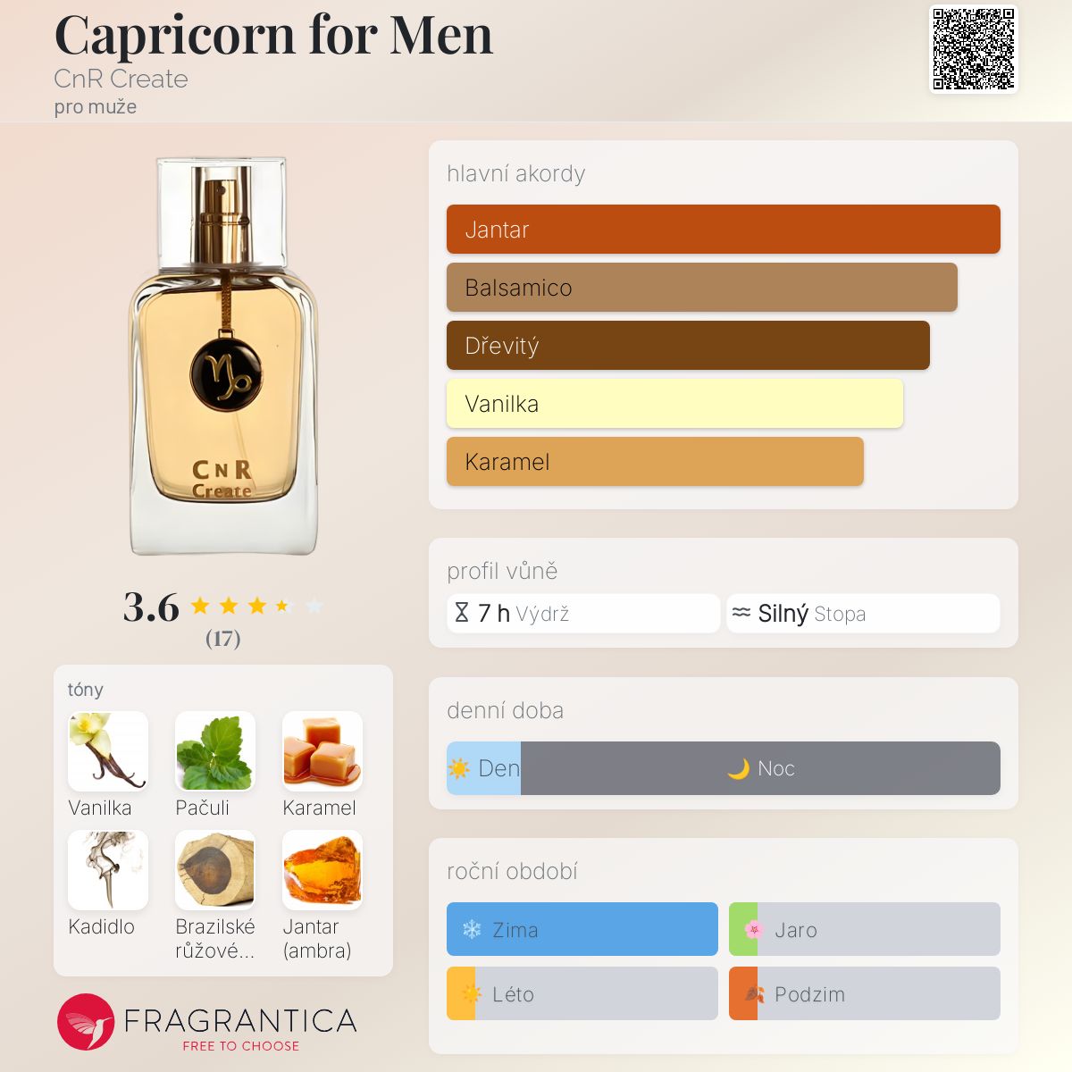Capricorn for Men podle CnR Create je Orientální Fougere vůně pro muže. Capricorn for Men byl/a uveden/a v roce 2010. "Nosem" za touto vůní je Olivier Funel. Vrchní tóny jsou Citrón, Mandarinka a Grapefruit; střední tóny jsouPačuli, Karamel a Brazilské růžové dřevo ; základní tóny jsou Vanilka, Kadidlo, Jantar (ambra) a Pižmo.
