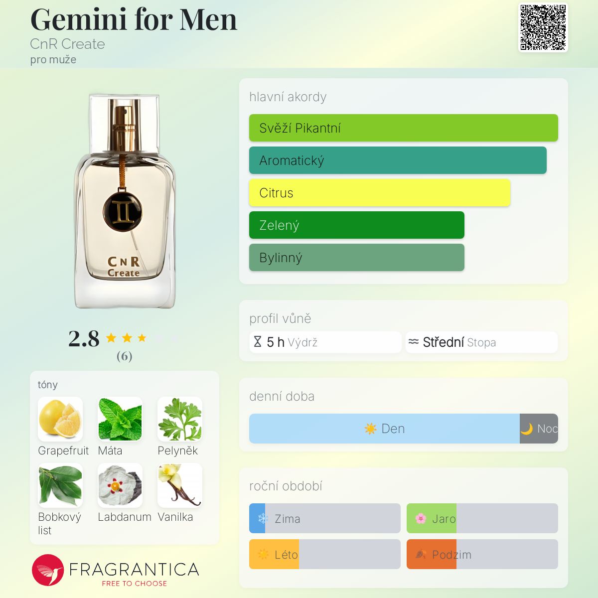 Gemini for Men podle CnR Create je Aromatic Spicy vůně pro muže. Gemini for Men byl/a uveden/a v roce 2010. "Nosem" za touto vůní je Olivier Funel. Vrchní tóny jsou Grapefruit, Máta a Levandule; střední tóny jsouPelyněk, Bobkový list a Francouzské labdanum ; základní tóny jsou Vanilka a Badyán.
