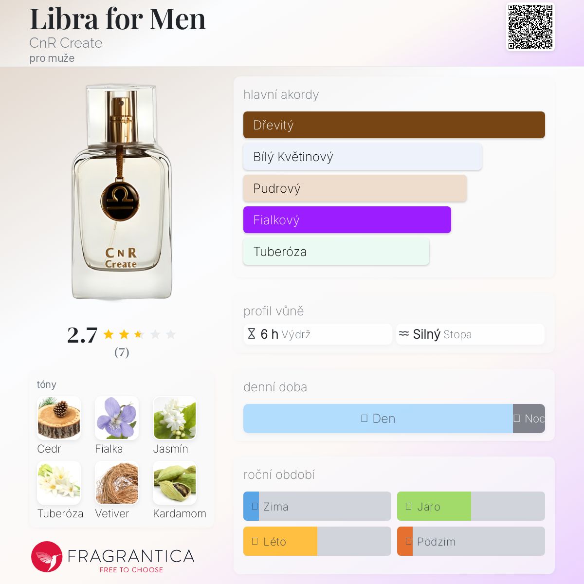 Libra for Men podle CnR Create je Woody Spicy vůně pro muže. Libra for Men byl/a uveden/a v roce 2010. "Nosem" za touto vůní je Olivier Funel. Vrchní tóny jsou Jasmín, Kardamom a Skořice; střední tóny jsouVirginský cedr, Tuberóza a Francouzské labdanum ; základní tóny jsou Fialka, Vetiver a Balzám Tolu.