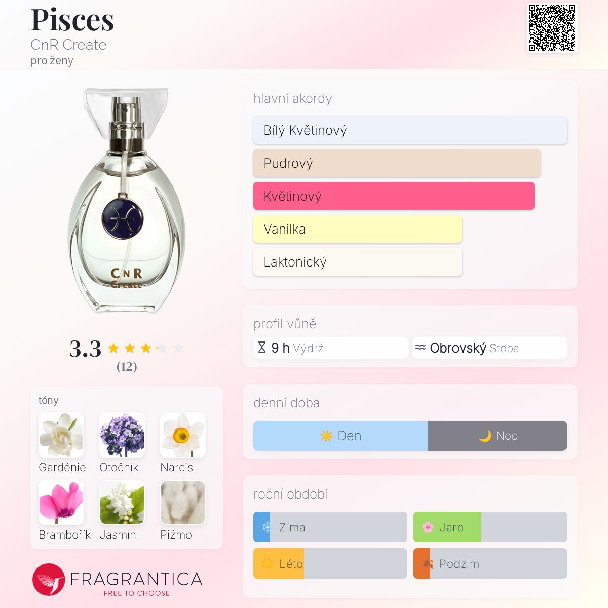 Pisces podle CnR Create je Floral vůně pro ženy. Pisces byl/a uveden/a v roce 2008. "Nosem" za touto vůní je Olivier Funel. Vrchní tóny jsou Gardénie, Brambořík, Jasmín a Kamélie; střední tóny jsouOtočník a Narcis ; základní tón je Pižmo.